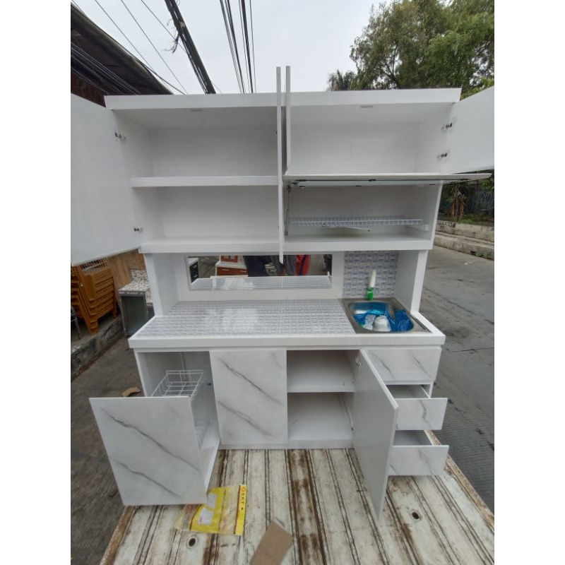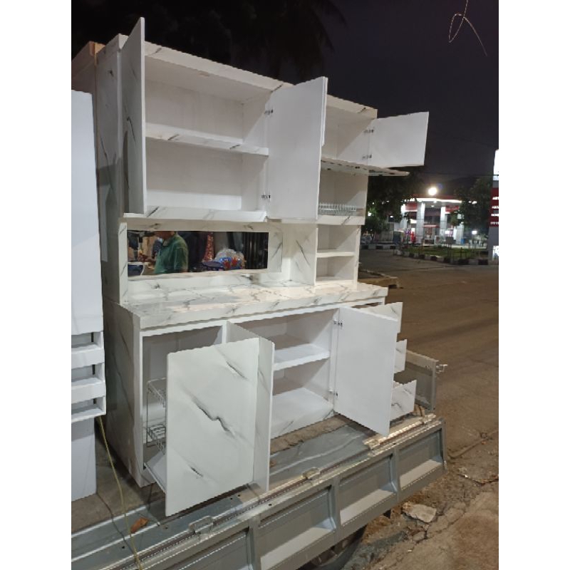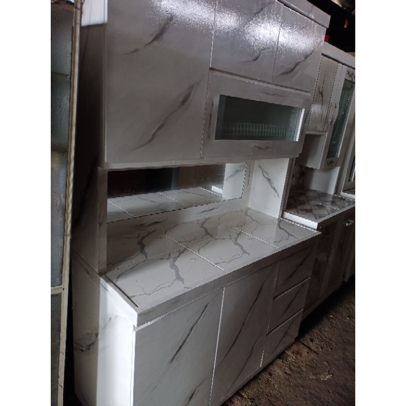 rak piring lemari sayur kayu dapur minimalis hidrolik pintu Sorong sleding cermin keramik laci 3 rell. motif matmer.. we