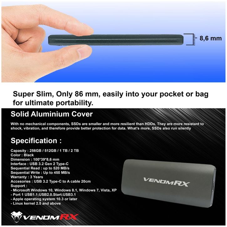 SSD External Portable SSD External 512GB 1TB 2TB VenomRX Super Speed USB 3.2 Gen2 Type-C Solid-state Drive Storage