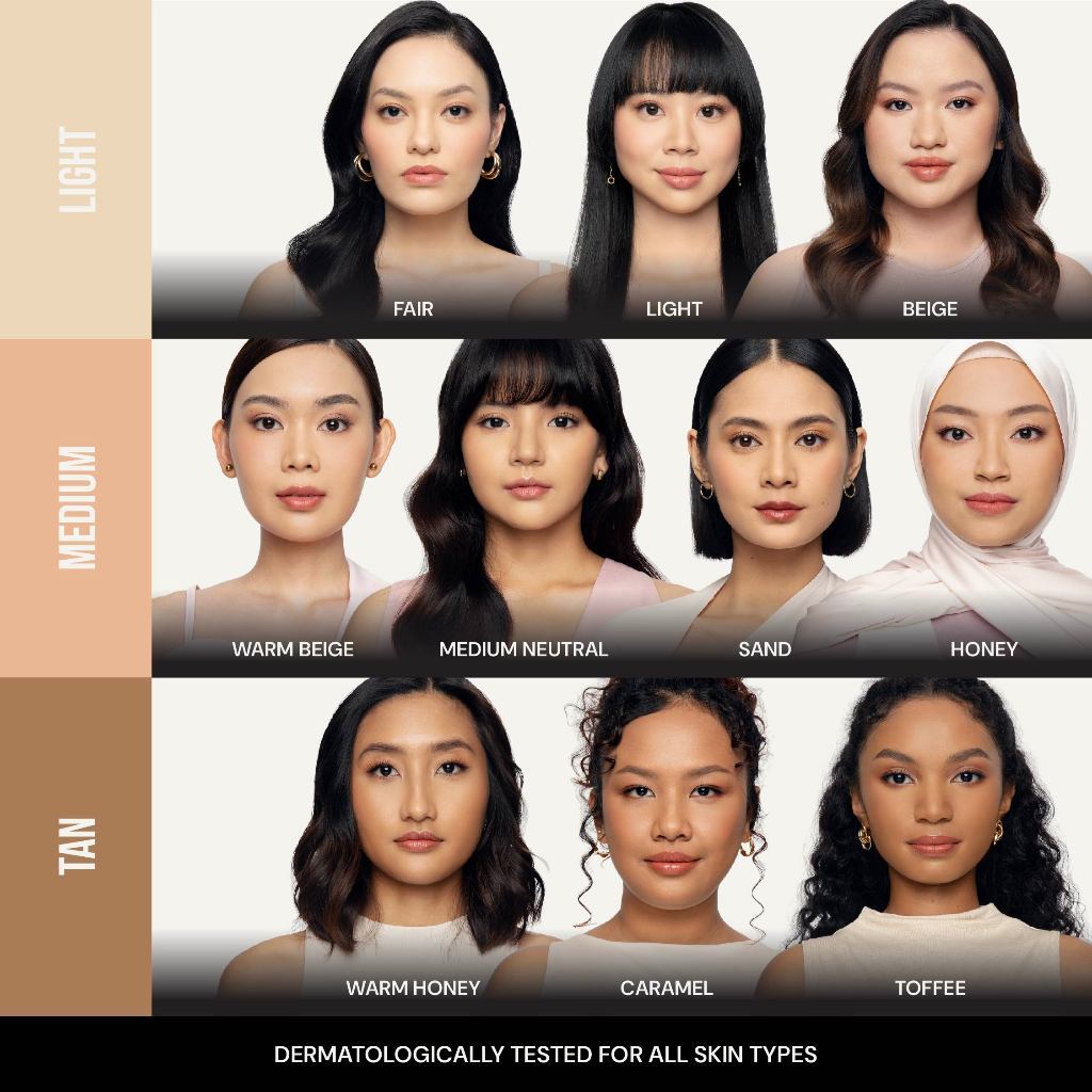 Fair, Light, Beige, Warm Beige, Medium Neutral, Sand, Honey, Warm Honey, Caramel, Toffee