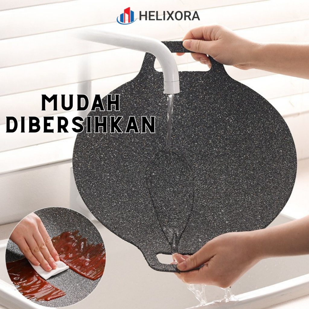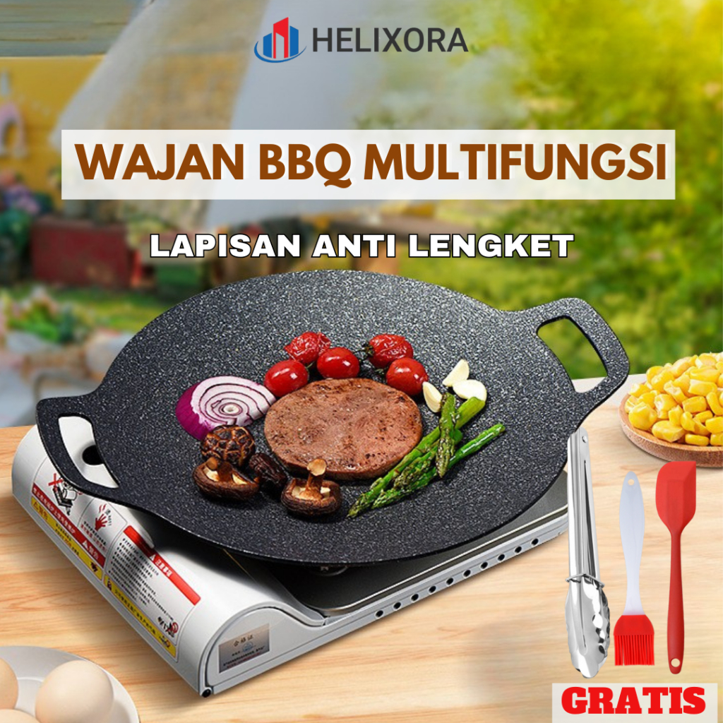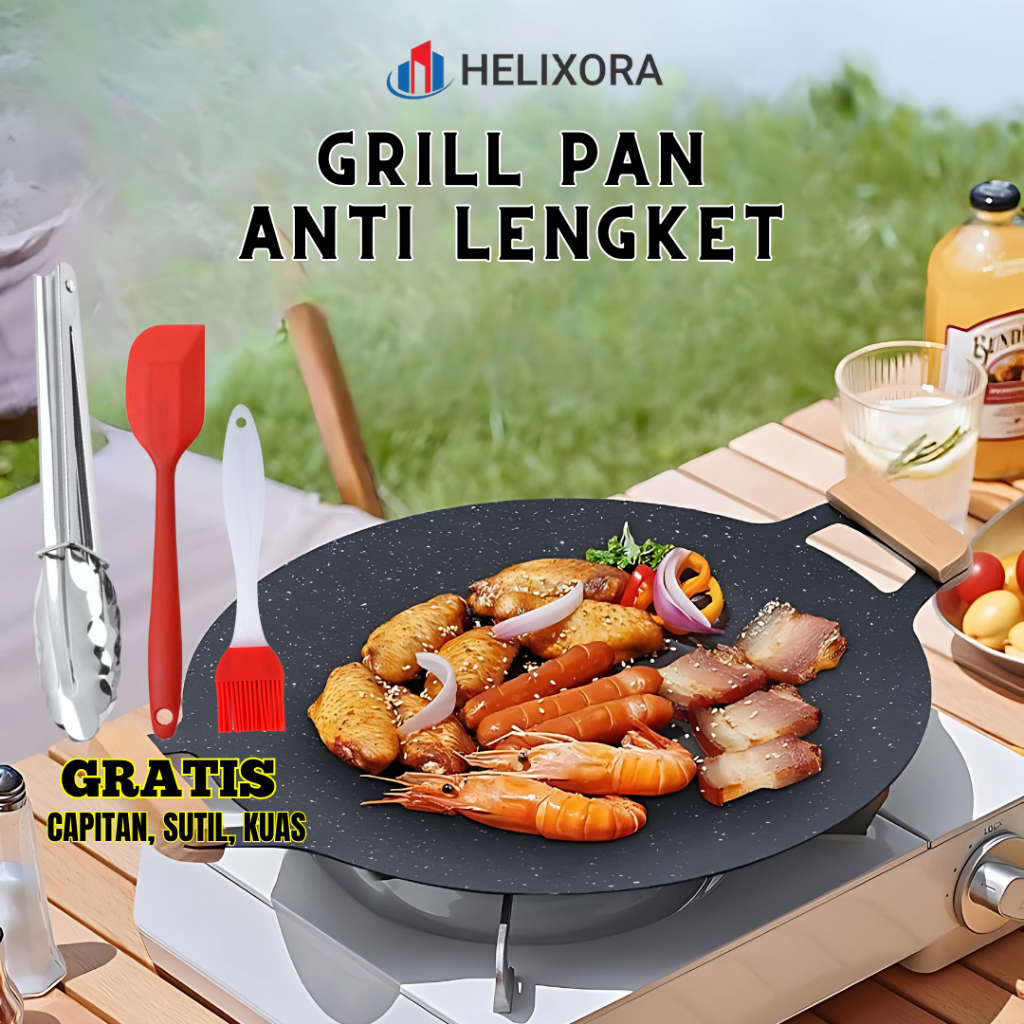 HELIXORA B2 Grill Pan 38 CM Wajan Panggangan BBQ Bulat Anti Lengket + Penjepit & Kuas