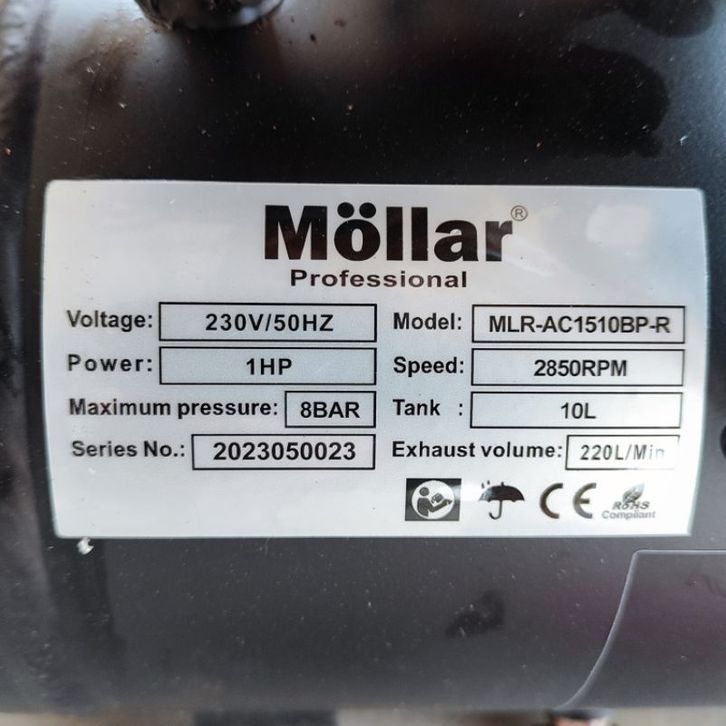 Mollar 1 HP 10 Liter Super Speed Mesin Kompresor Oiless Silent 8 Bar High RPM AC1510BP-R