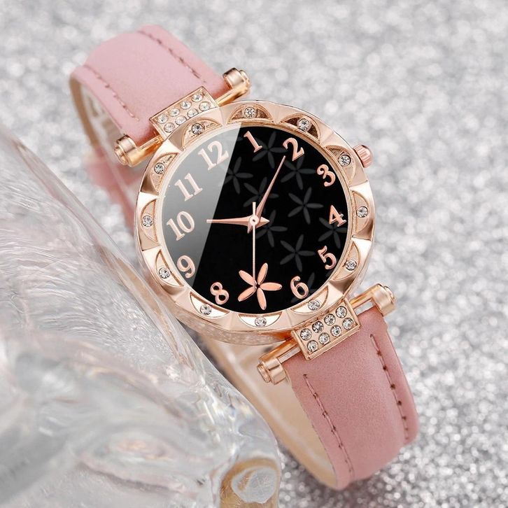 jam tangan wanita set 4PCS Set Jam Tangan Wanita mo-de Bunga Dial Jam Tangan Kuarsa Jam Tangan Kulit Gelang Gelang Jant