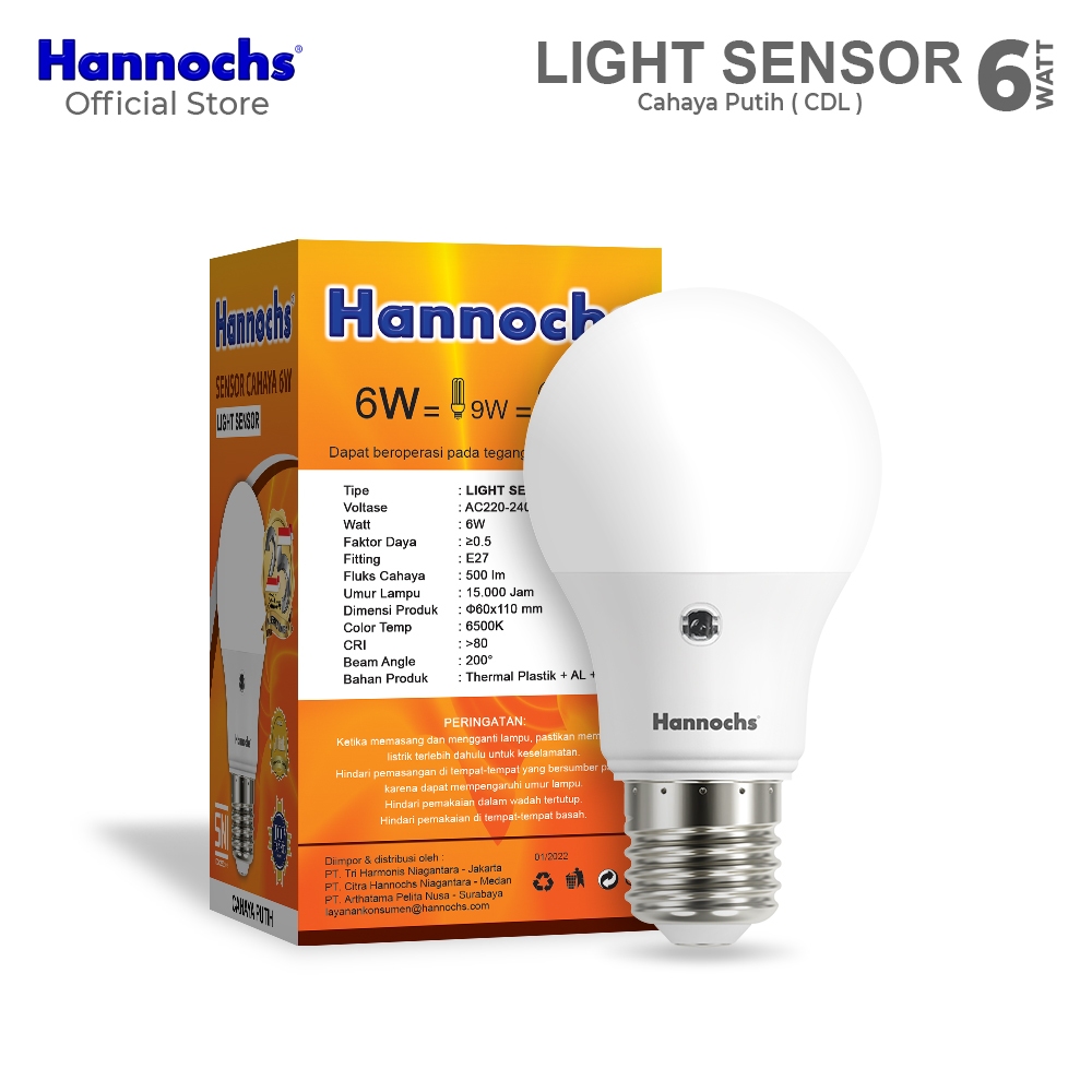 Hannochs Lampu Bohlam LED Light Sensor/Sensor Cahaya 6W Cahaya Putih