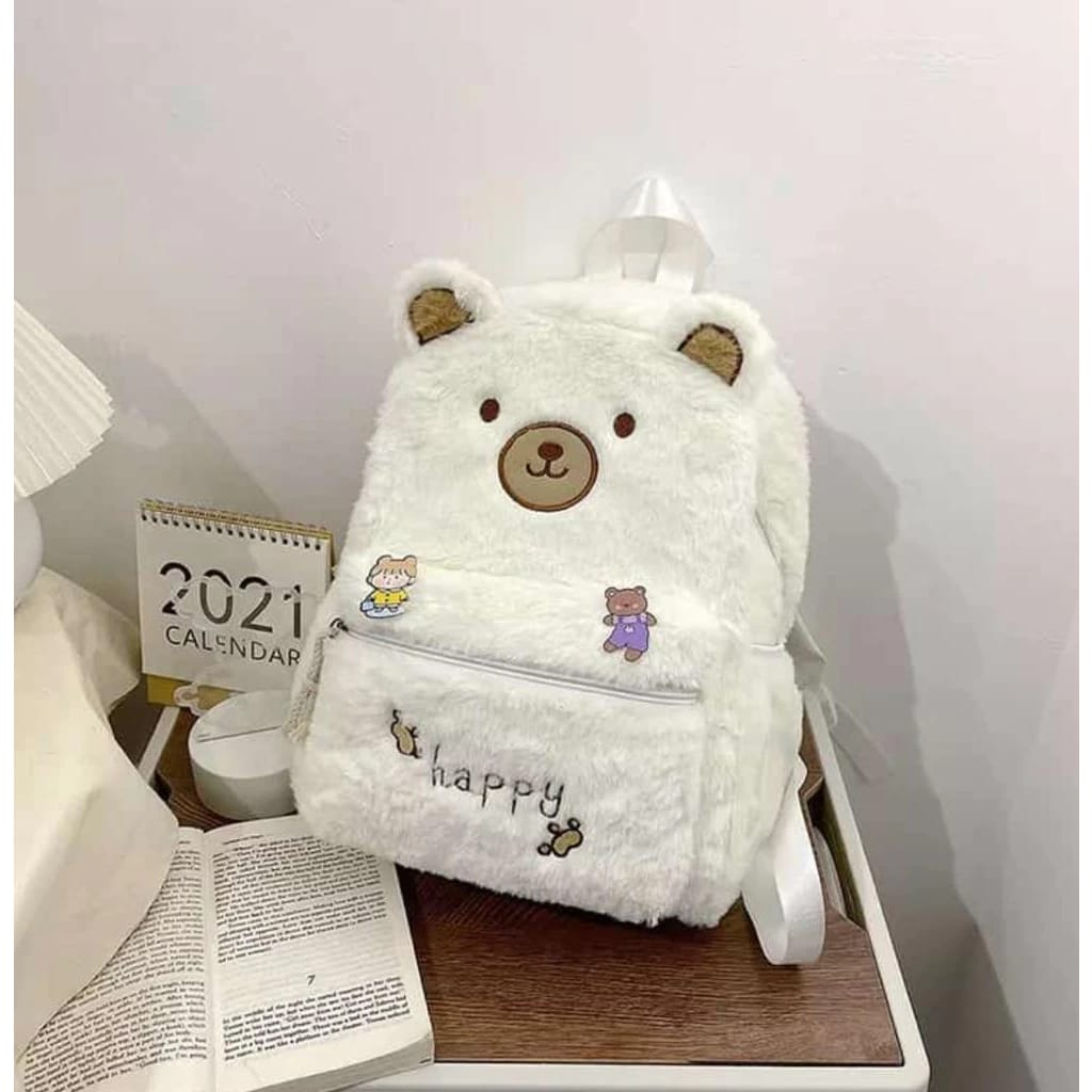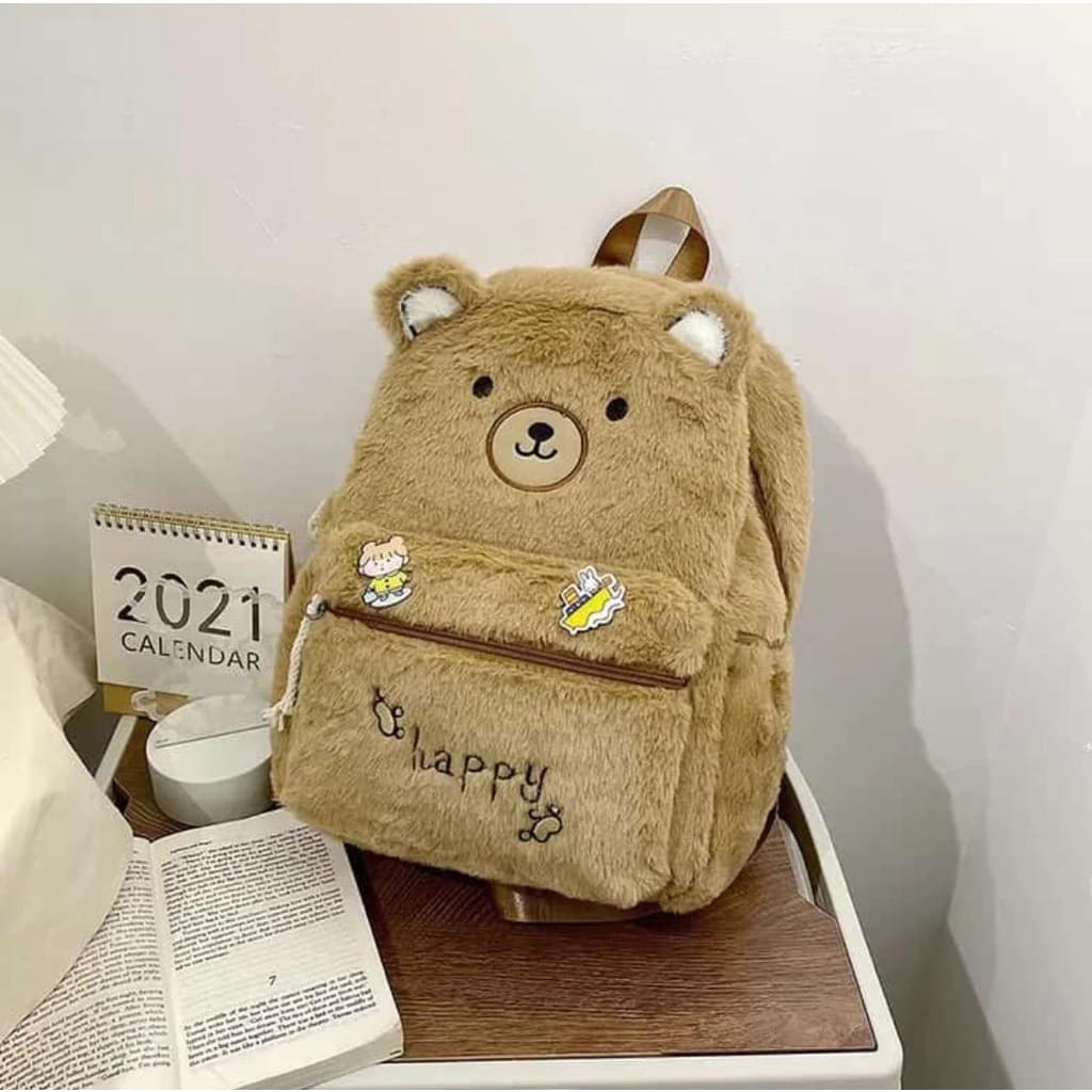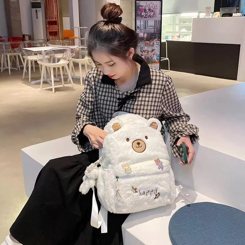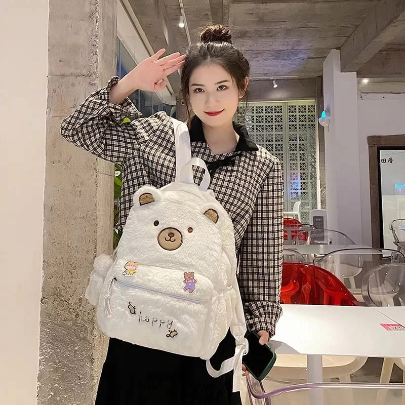 Tas Ransel Wanita Bulu Backpack Motif Beruang Happy Bear Tas Perempuan Korean Lucu