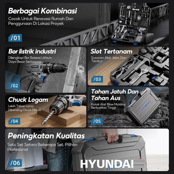 HYUNDAI Mesin Bor Listrik Set Lengkap Baterai Cordless Alat Tukang Tool Kit Tang Obeng Palu Kunci Pas Pita Pengukur