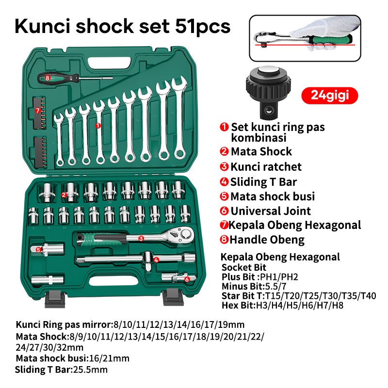 ISKU Kunci Sok Set 51pcs/53pcs/37pcs/82pcs Tool Kit Set 24gigi/72gigi Kunci Shock Set Lengkap Kunci Ring Pas Set 8-19mm 1/2 kunci Mata Sok lengkap 19pcs Kombinasi