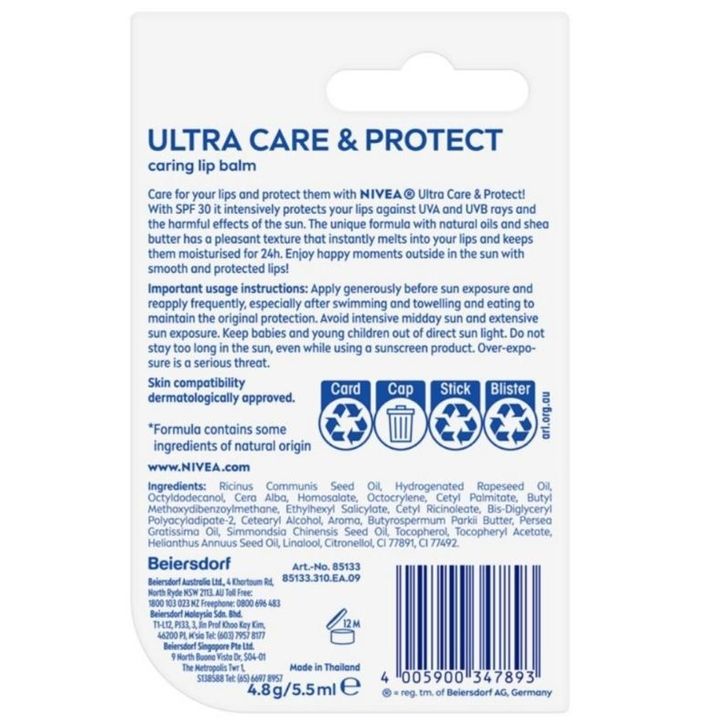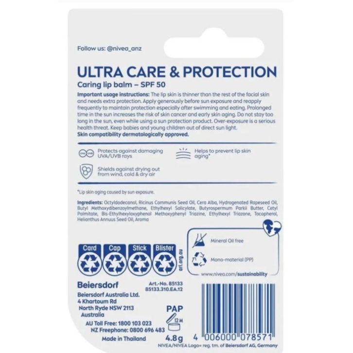 Lip SPF Nivea - Ultra Care & Protection SPF50 / SPF 30 Lip Balm 4,8g