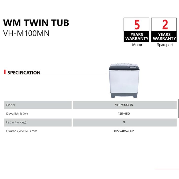 Toshiba VH-M100MN Mesin Cuci 2 Tabung 9Kg . Baru & Bergaransi