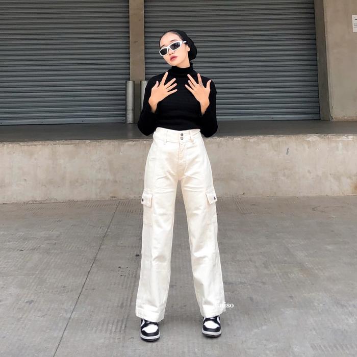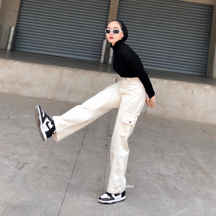 JINISO HANDS UP - 403 Cargo Loose Highwaist Celana Jeans Wanita Warna Khaki