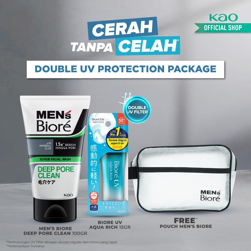 [Double Protection Kit] Men's Biore Double Scrub Sabun Muka Pria Deep Fresh 100 gr + UV Aqua Rich Sunscreen Watery Essence 15 gr