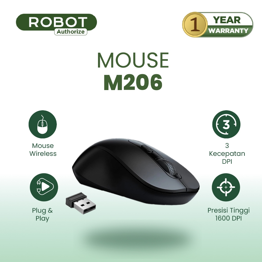 [Mall] ROBOT M206 MOUSE WIRELESS 2.4GHZ OPTICAL 1600DPI COCOK UNTUK PC/LAPTOP ORIGINAL - GARANSI 1 TAHUN