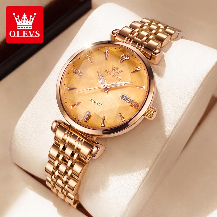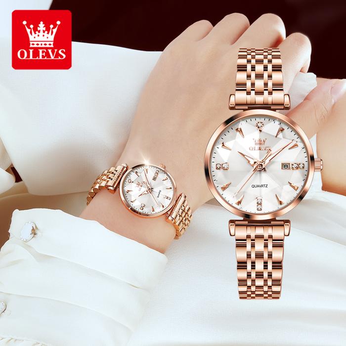 OLEVS Jam Tangan Wanita Anti Air Original 2023 Korea Permukaan Cermin Prismatik Stainless Steel