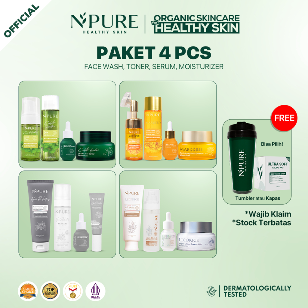 【PAKET 4PCS】NPURE Paket Face Wash + Toner + Serum + Moisturizer Cica Acne - Marigold Anti Aging - Noni