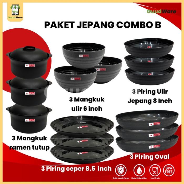 Set paket Ramen jepang hitam piring makan gelas dan mangkuk Kitchenware Plastik pp 5 Food Grade - Paket Jepang A