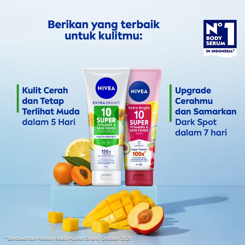 NIVEA Body Serum Extra Bright 10 Super Vitamins & Skin Foods Youth Protect Collagen 180ml x2 - Cerah dan terlihat muda dlm 5 hari - 150x Vitamin C