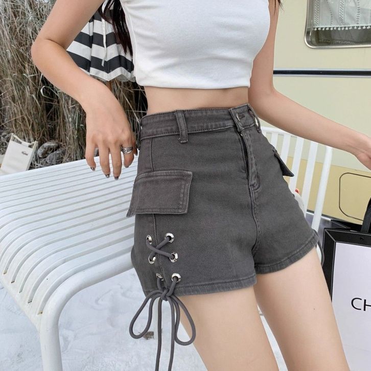 Celana Pendek Denim Vintage Wanita Dengan Tali Serut Celana Pendek Ramping Seksi Dan Pas Badan