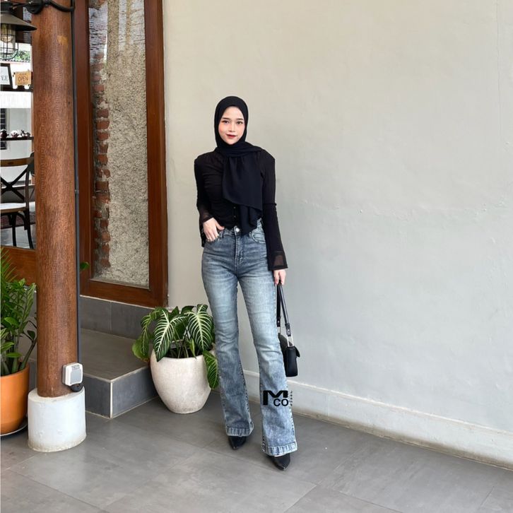 MCOJEANS - Celana Ultra Highwaist Cutbray Snow Abu Polos Panjang Basic Jeans Wanita - Celana Denim Cewek