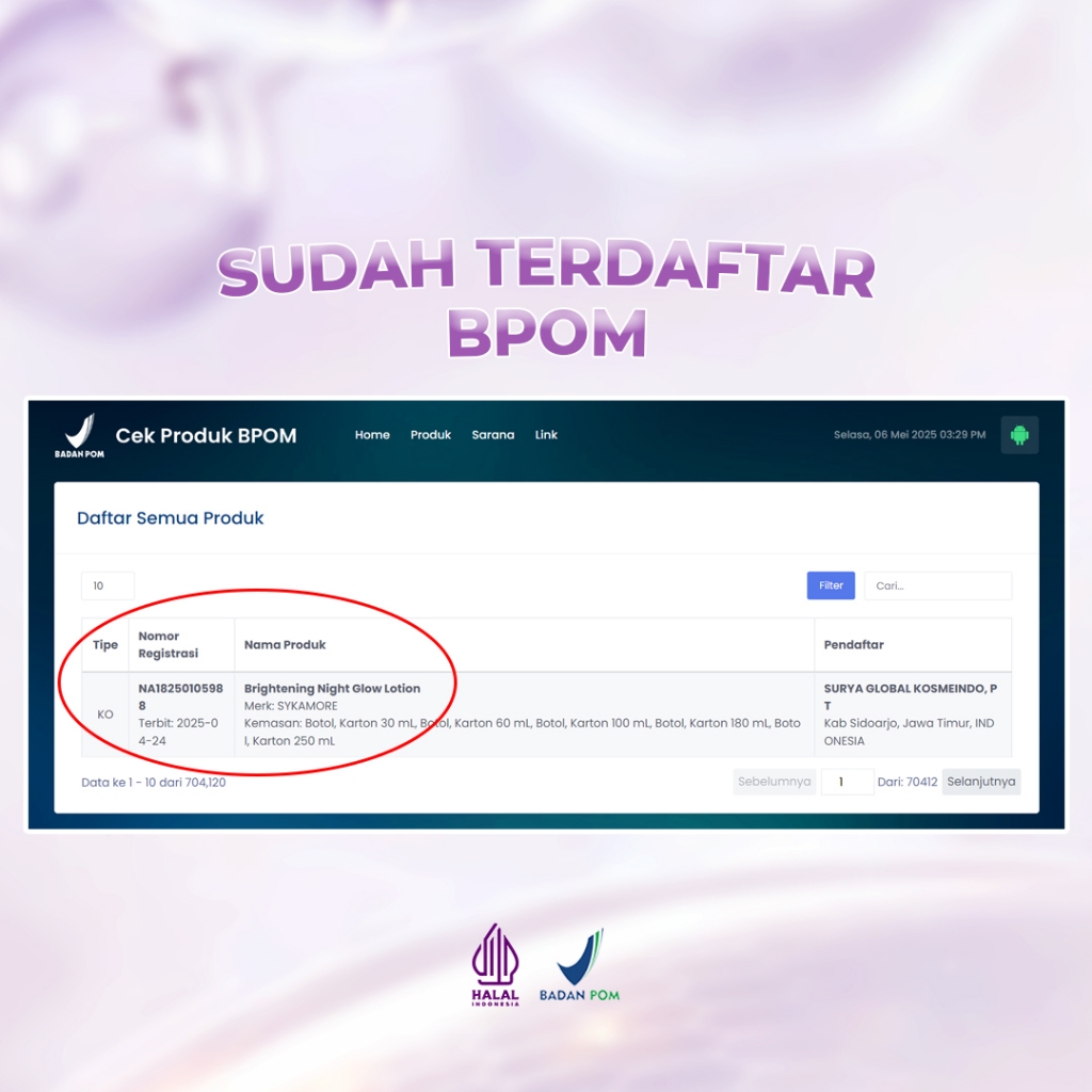 Sykamore Brightening Night Glow Lotion HB Dosting Pemutih Badan With Niacinamide & Alpha Arbutin
