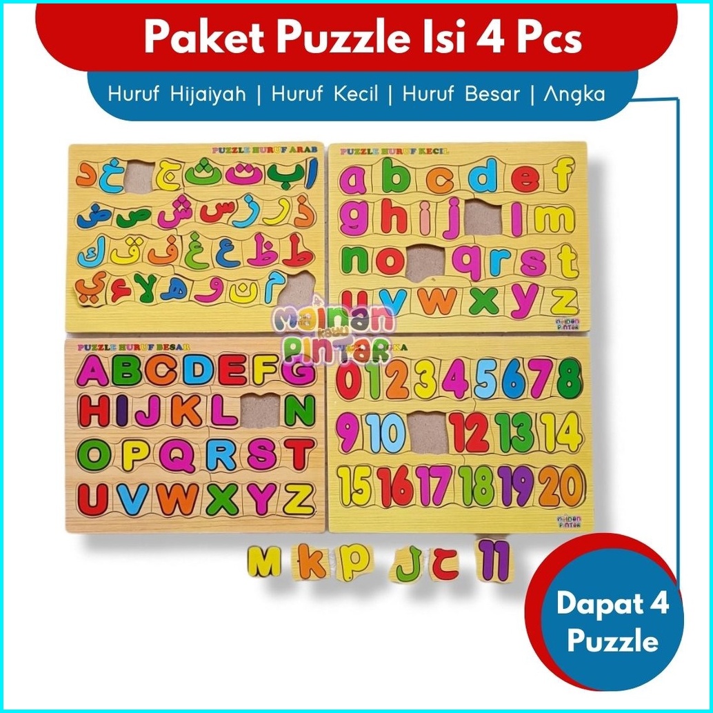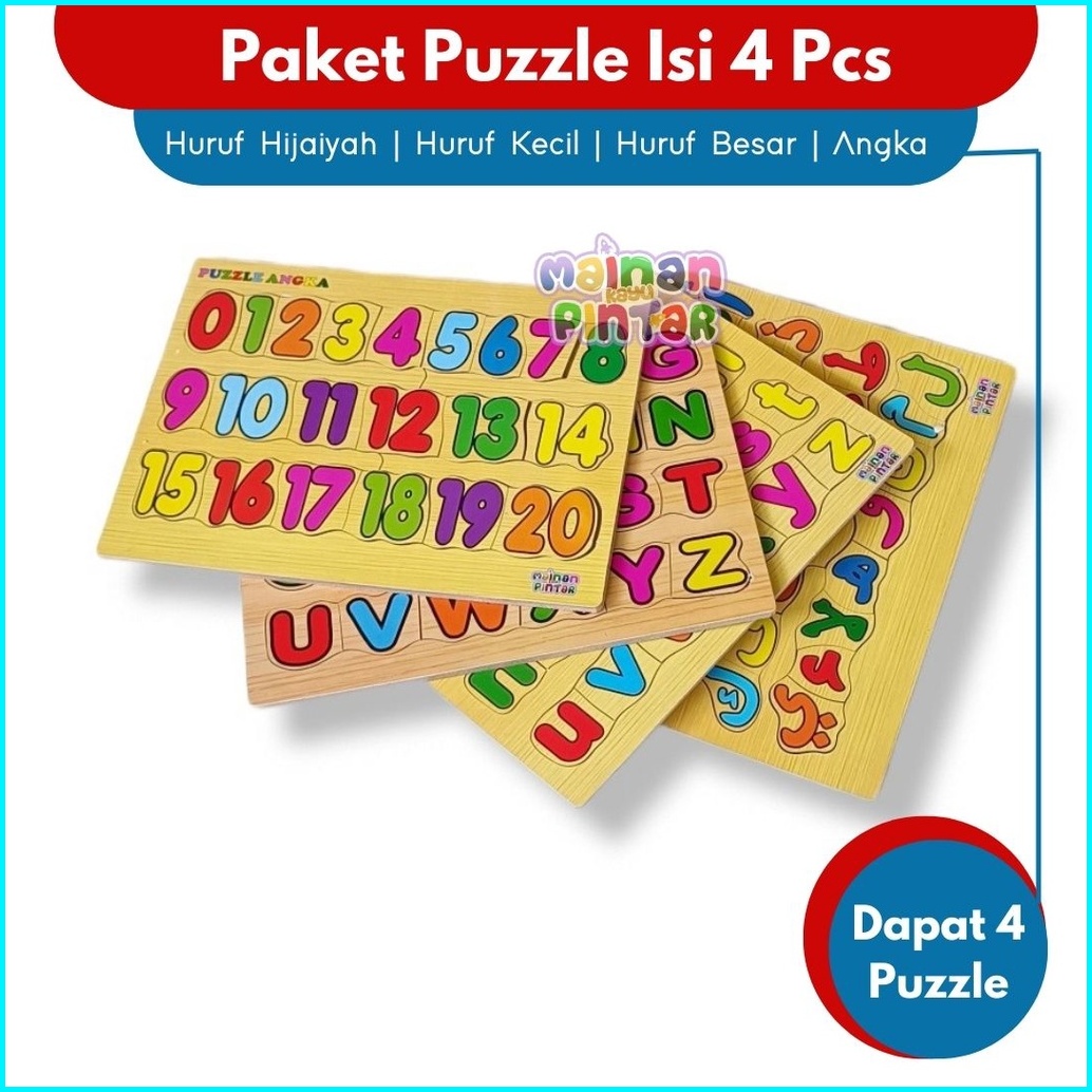Puzzle Kayu Isi 4 Huruf Hijaiyah Arab Huruf Besar Kecil Angka 0-20