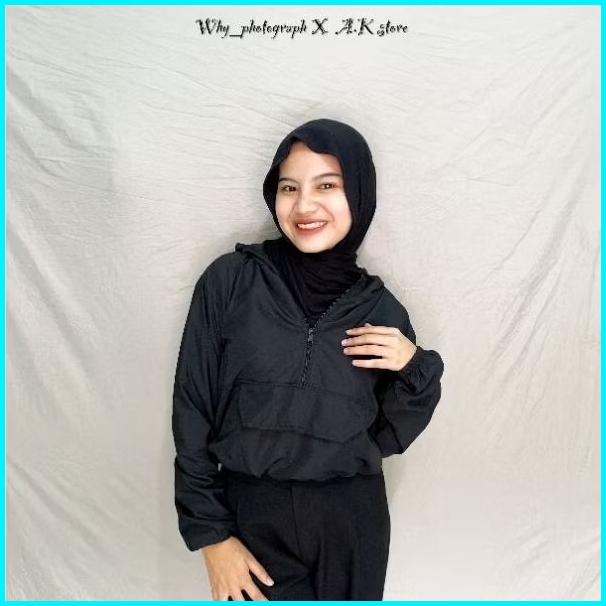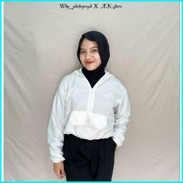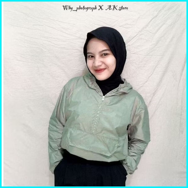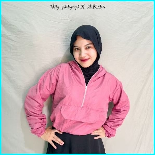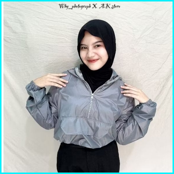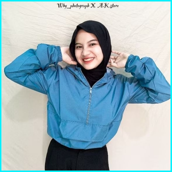 Jaket Olahraga Crop Wanita Parasut Dengan Saku Depan Sport