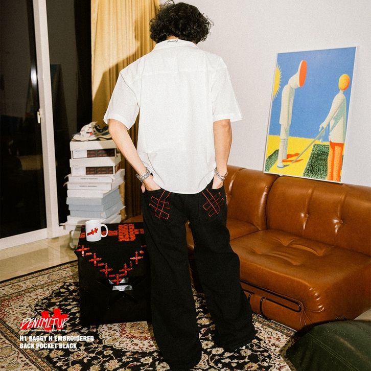 TERLARIS H1 BAGGY H EMBROIDERED BACK POCKET - BLACK - CELANA JEANS
