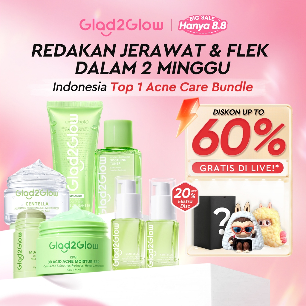 GLAD2GLOW ACNE BUNDLE 7IN1 PAKET SKINCARE-MOISTURIZER+SERUM+CLEANSER+TONER+ CLAY STICK+ GEL MASK- SKINCARE SET BEAUTY SE