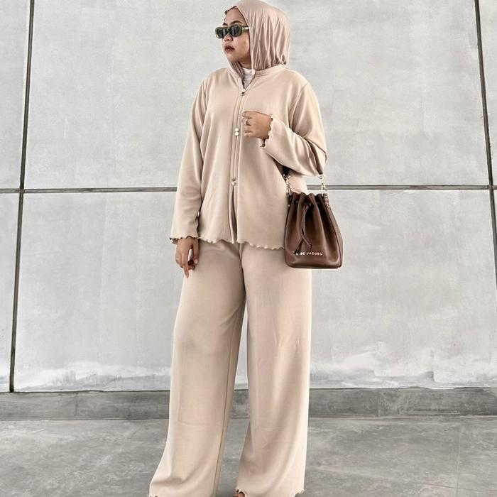 DENACOLLECTION MAZAYA SETELAN CELANA KULOT BAJU PANJANG BAHAN KNIT JAPAN CASUAL SANTAI WANITA - LATTE, STANDAR