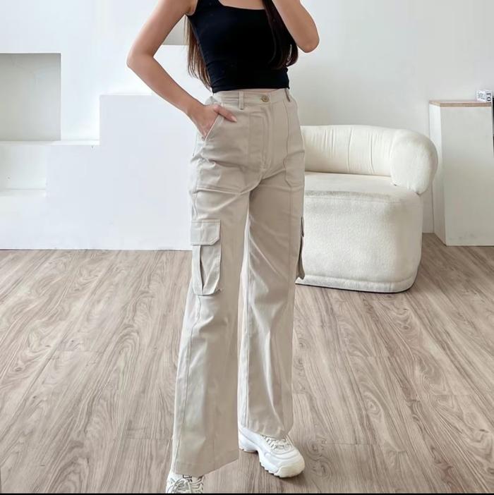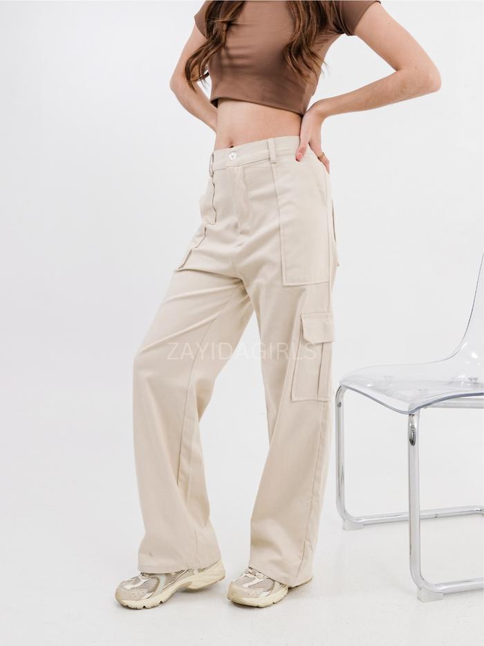 ZAYIDA - RORA CARGO PANTS - CELANA KARGO WANITA KATUN TWILL STRETCH MELAR HIGHWAIST LOOSE KOREAN STYLE JUMBO - CREAM, STANDAR
