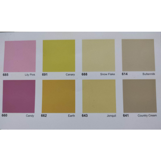 SUPER WHITE SW, 624 M white, 694 Abu-abu, 690 Avocado, 680 Green tea, 681 Cool Dream, 683 Sweet Blue, 670 Ivory, 661 Leaty, 686 Grand ocean, 663 Azure, 688 Snow Flake, 614 Buttermilk, 641 Country Cream, 691 Canary, 685 Lily Pink, 643 Joinqui, 662 Earth, 660 Candy Pink