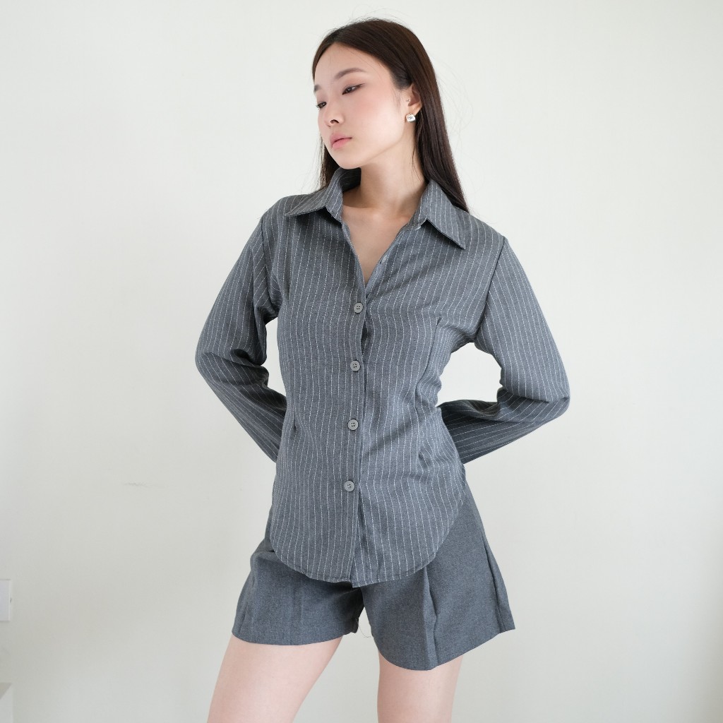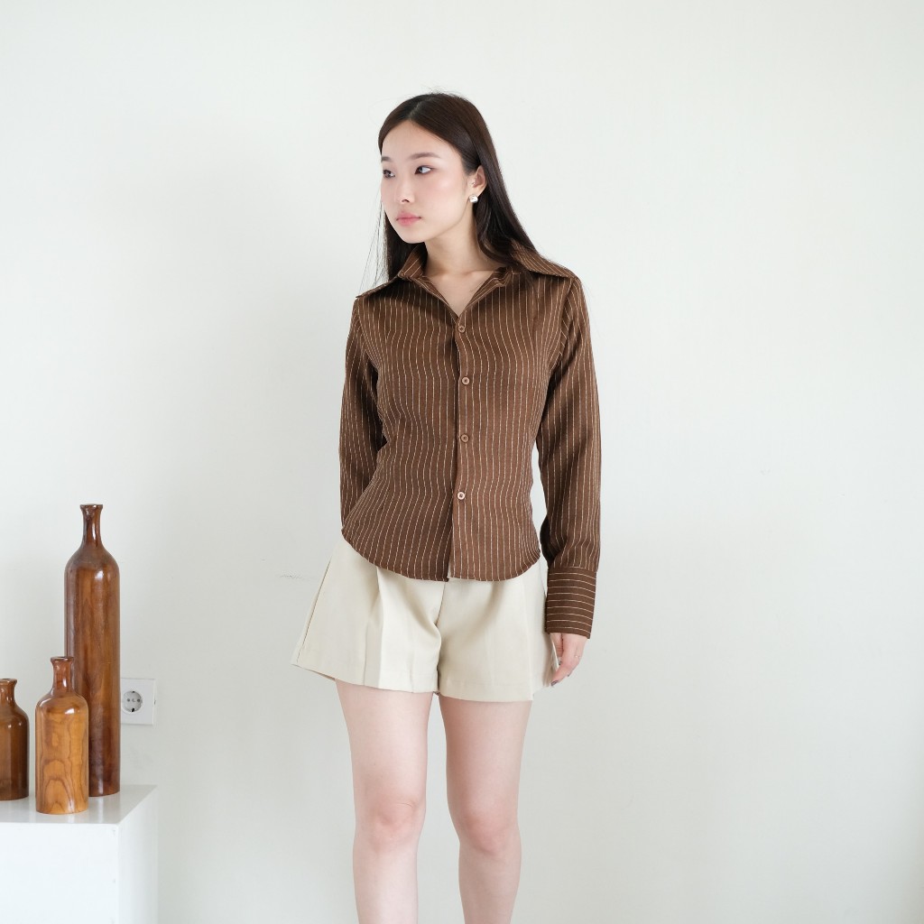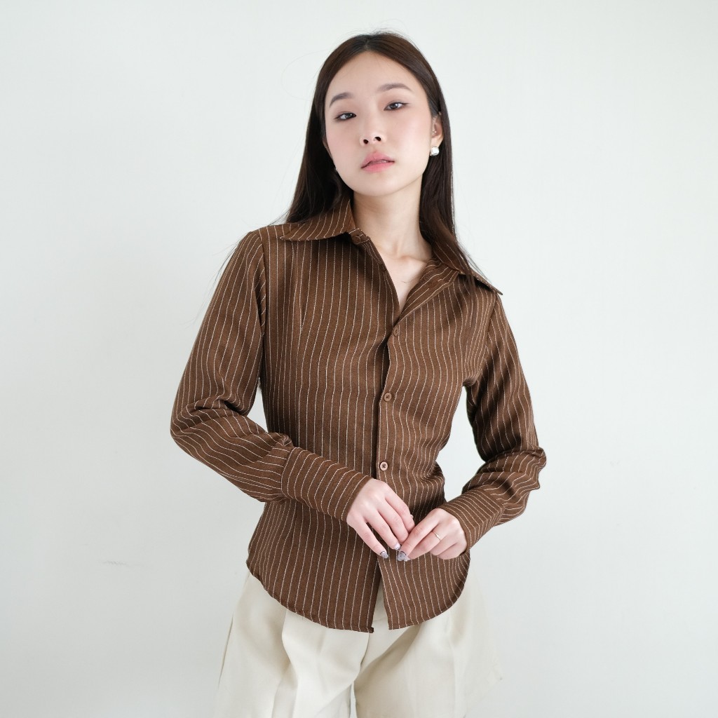 Hitav - Kemeja Wanita Lengan Panjang Terbaru Fitted Shirt Baju Atasan Wanita Slim Fit Garis Garis
