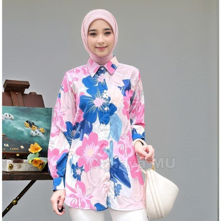 (TERLARIS)Kemeja Wanita Motif Print Flowers Lengan Panjang Premium Baju Atasan Cewe Kasual Forma