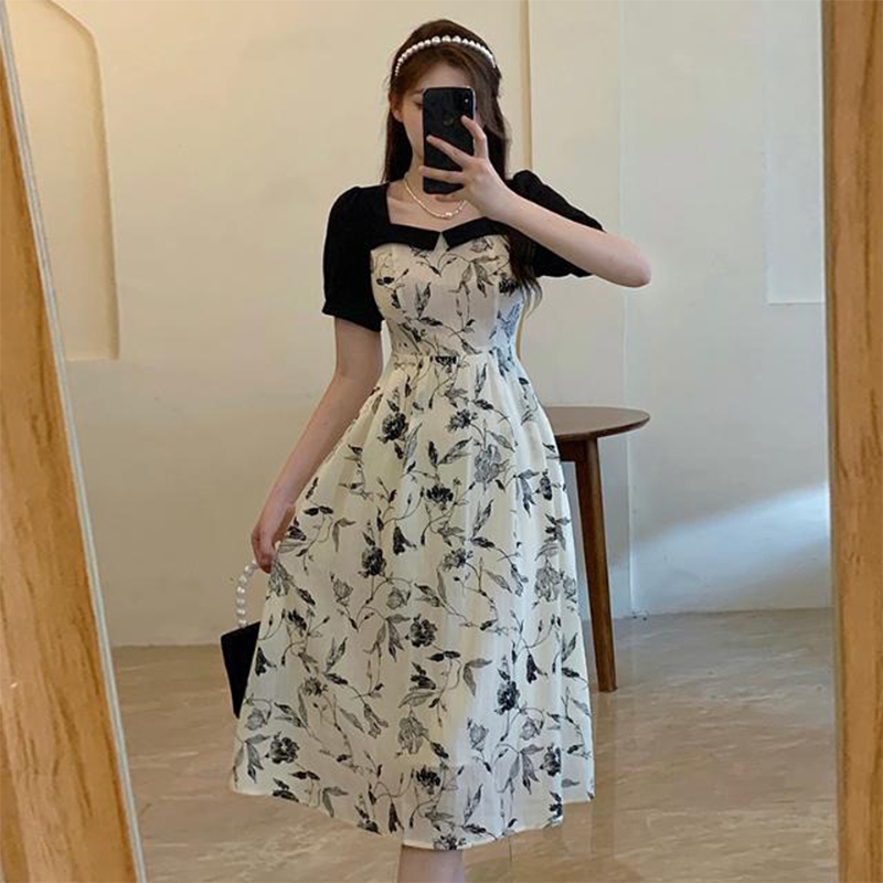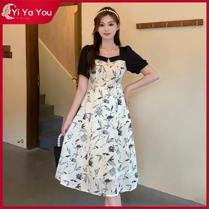 Yi Ya You - Best seller Dress floral kerah square kotak Dress Maxi panjang Dress pesta kekiniaan - gaun pesta mewah elegan dress bunga dress square neck K041