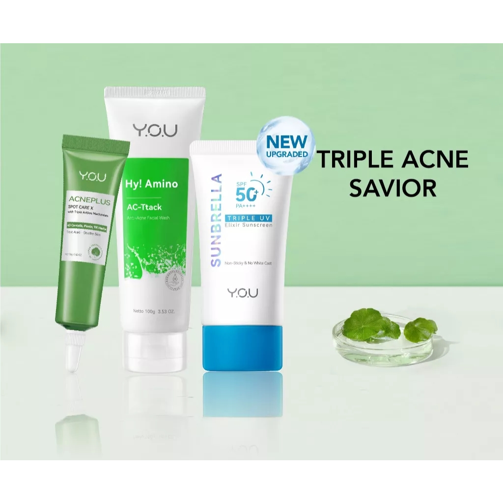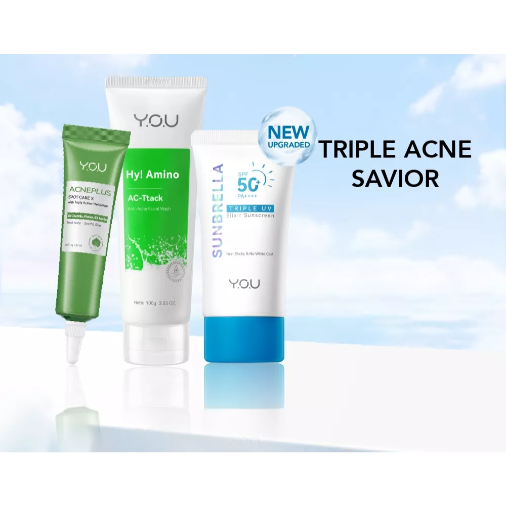 YOU 3-in-1 Acne Treatment Bundle | Anti Acne Facial Wash, Acneplus Spot Care, Triple UV Elixir Sunscreen | Obat Totol Jerawat Paket Skincare