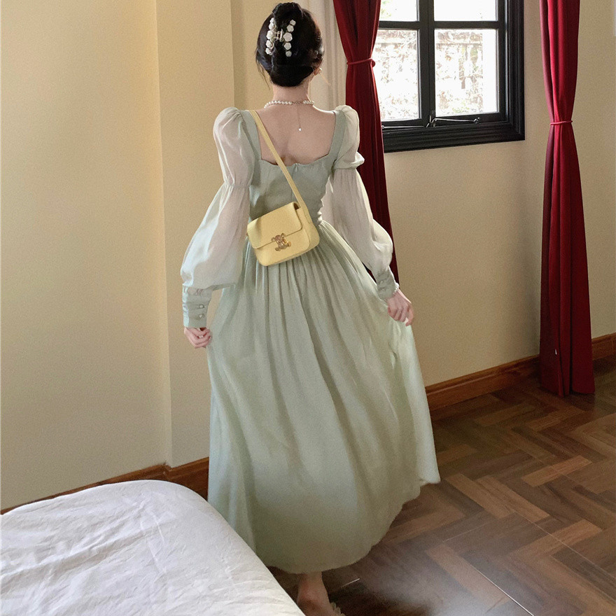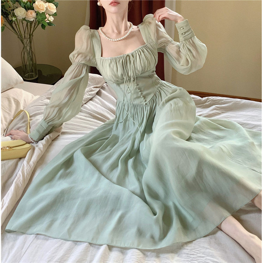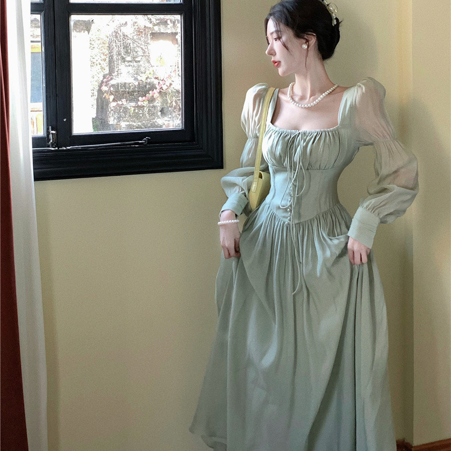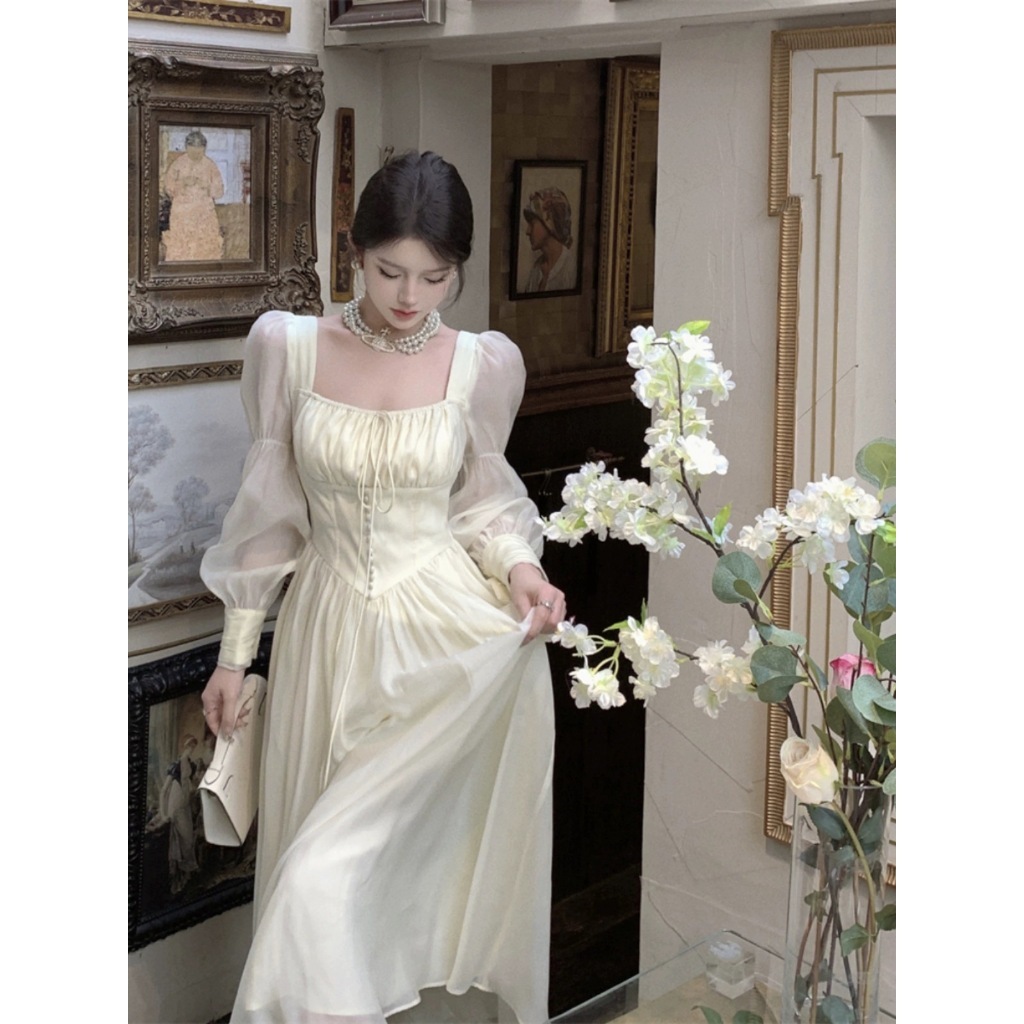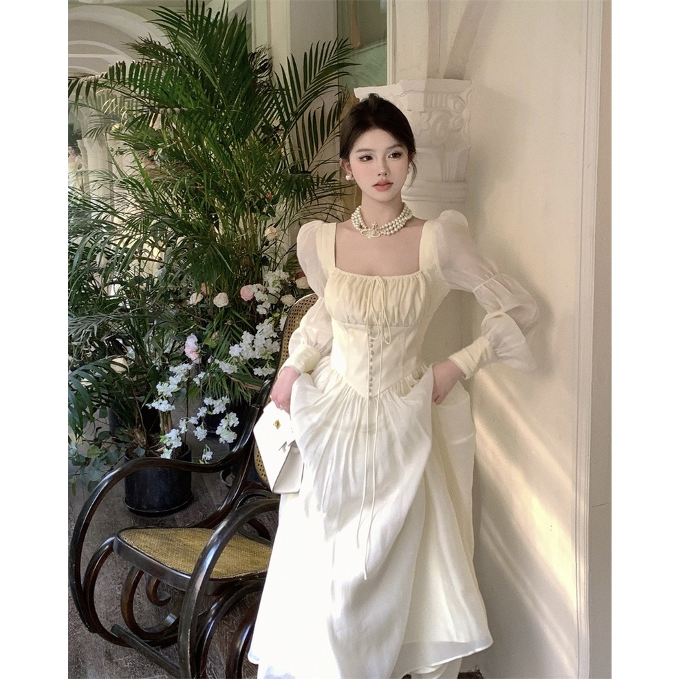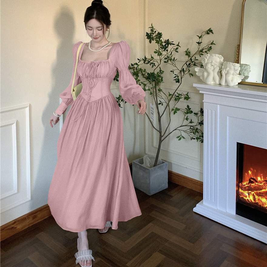 25OCLOCK - Gaun Panjang Liburan Untuk Wanita Di Awal Musim Gugur Gaun Pinggang Lengan Lentera Leher Persegi Modis Dan Segar Gaya Baru