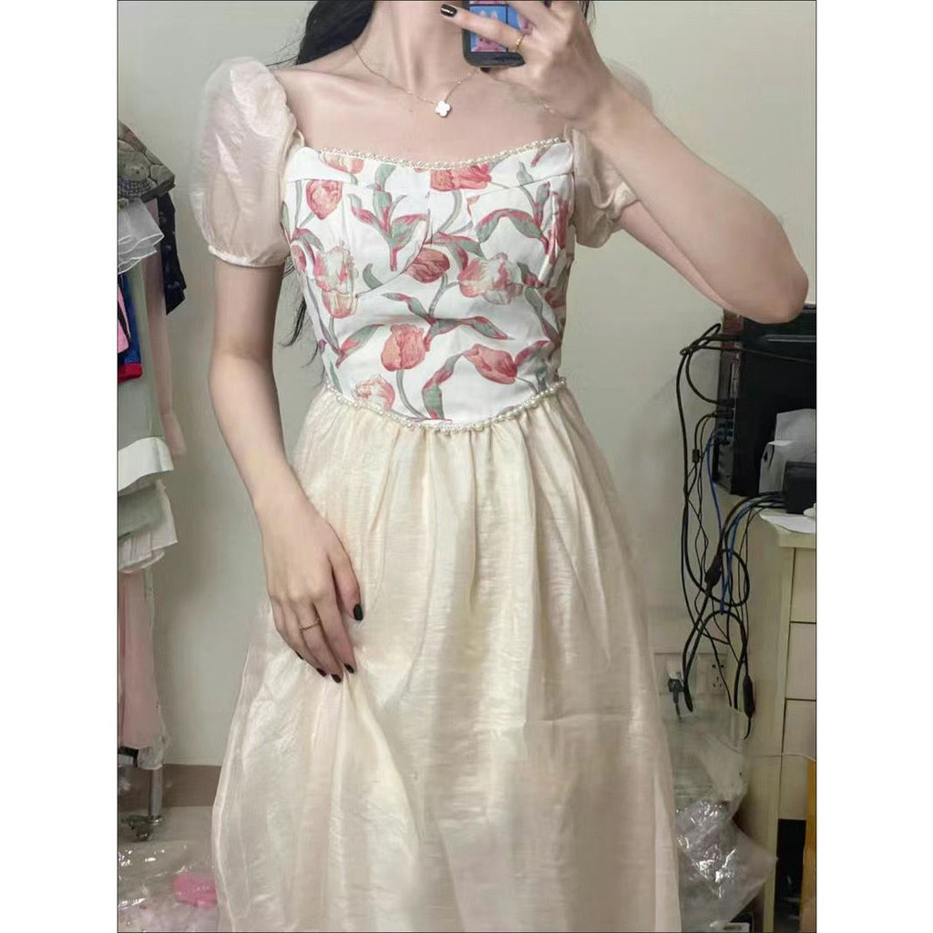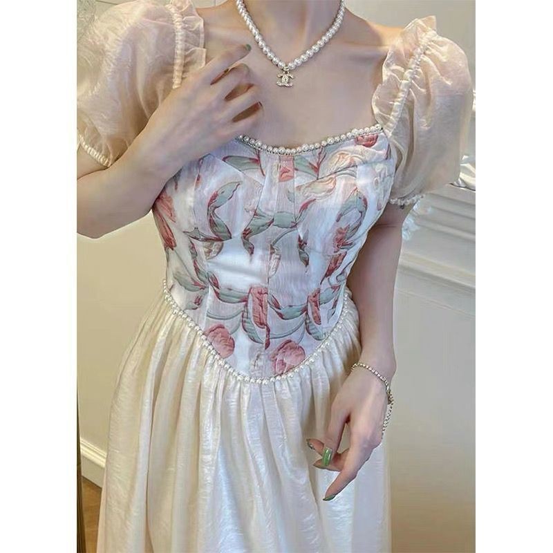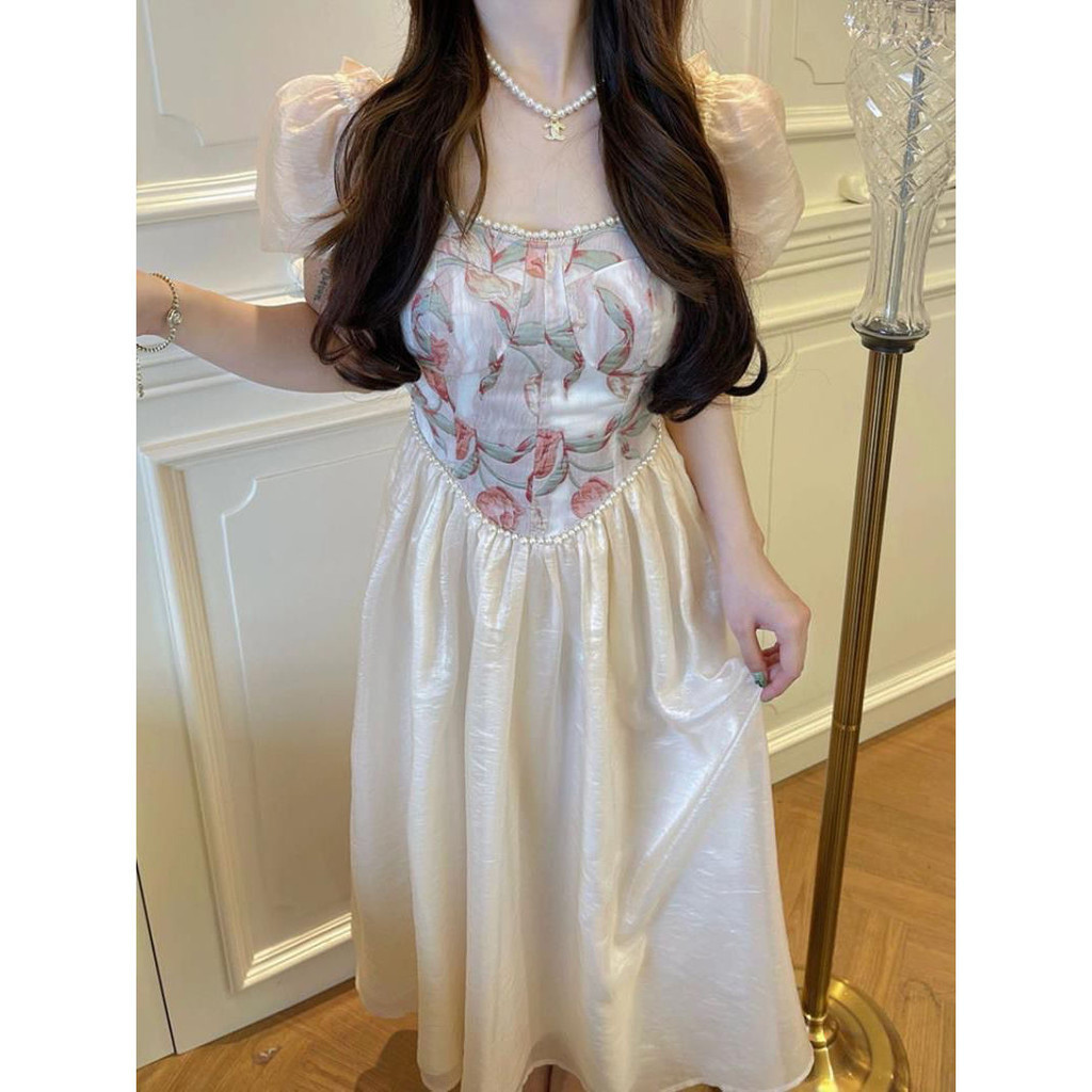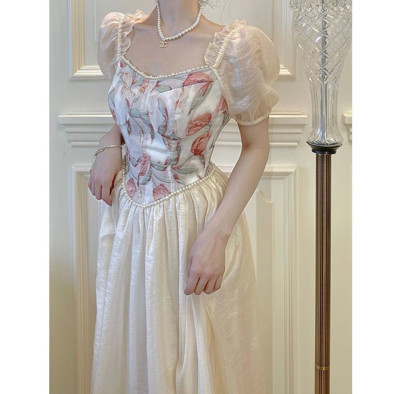 Gaun Lengan Puff Gaya Istana Hepburn Prancis, Rok Panjang Pinggang Jacquard Tugas Berat Kelas Atas