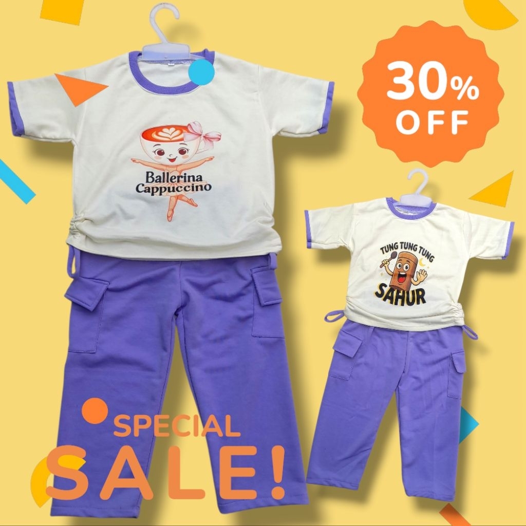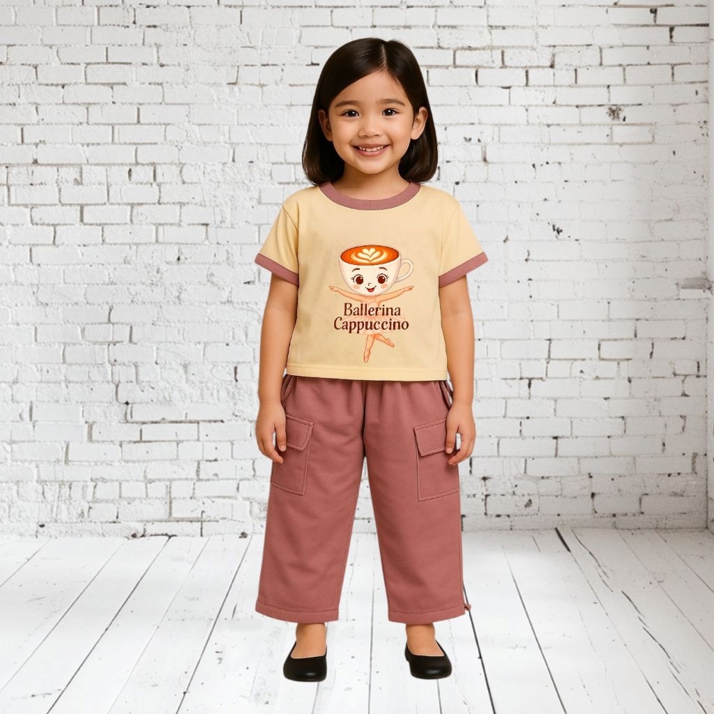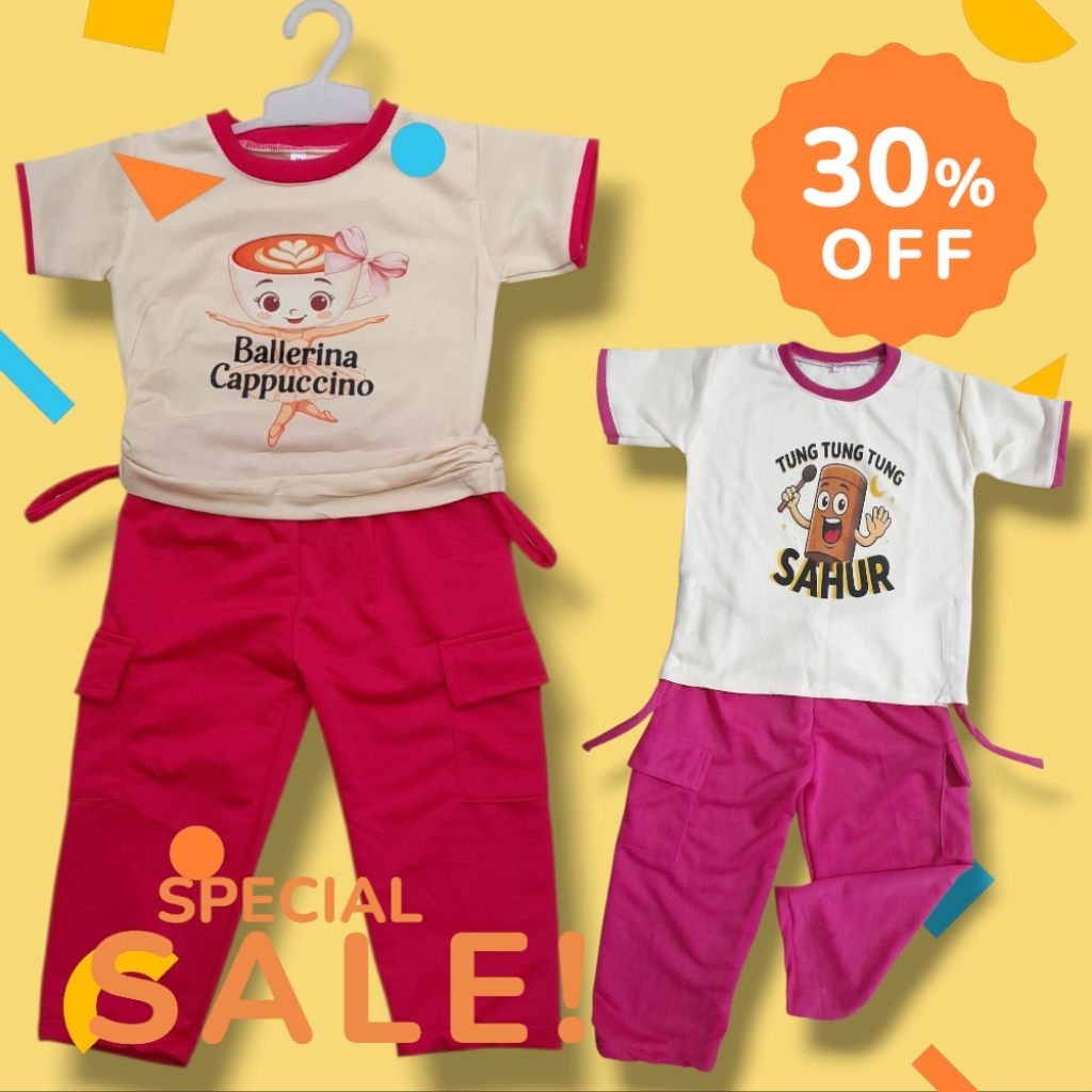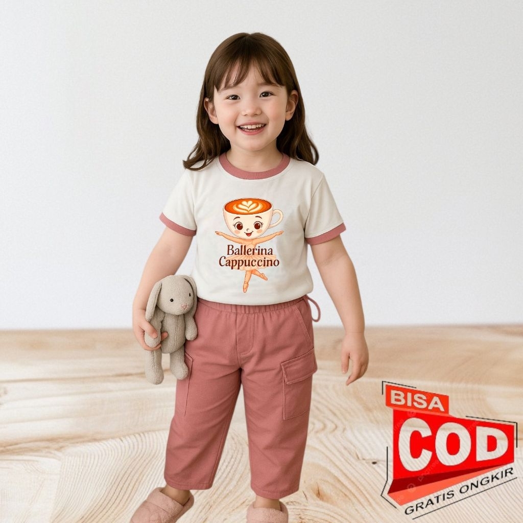 Stelan Baju Serut Dan Celana Cargo Anak Perempuan Karakter Anomali Ballerina Cappucina Dan Tung Tung Sahur 1-7 Tahun