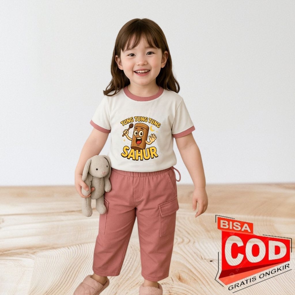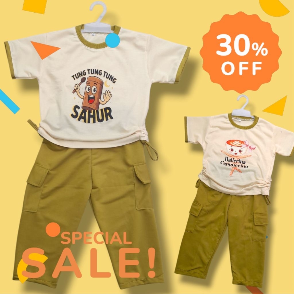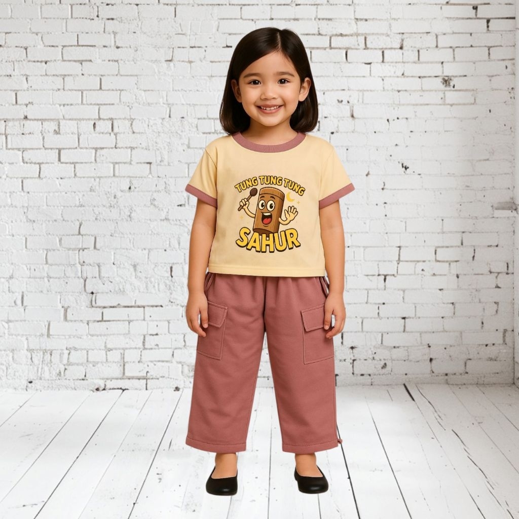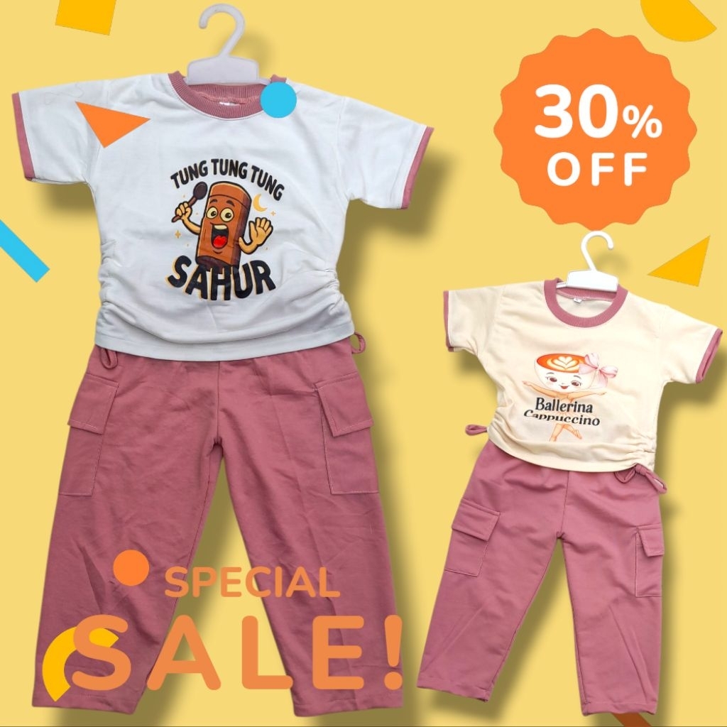 Stelan Baju Serut Dan Celana Cargo Anak Perempuan Karakter Anomali Ballerina Cappucina Dan Tung Tung Sahur 1-7 Tahun