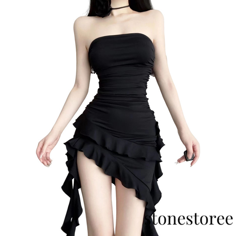 Manis Panas Hitam Gaun Wanita Ceruk Seksi Retraksi Pinggang Gaun Tanpa Tali Pita Gaun Pendek ST