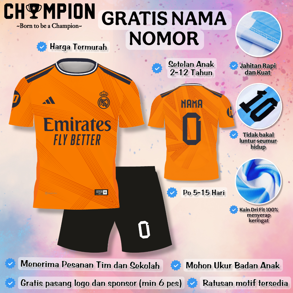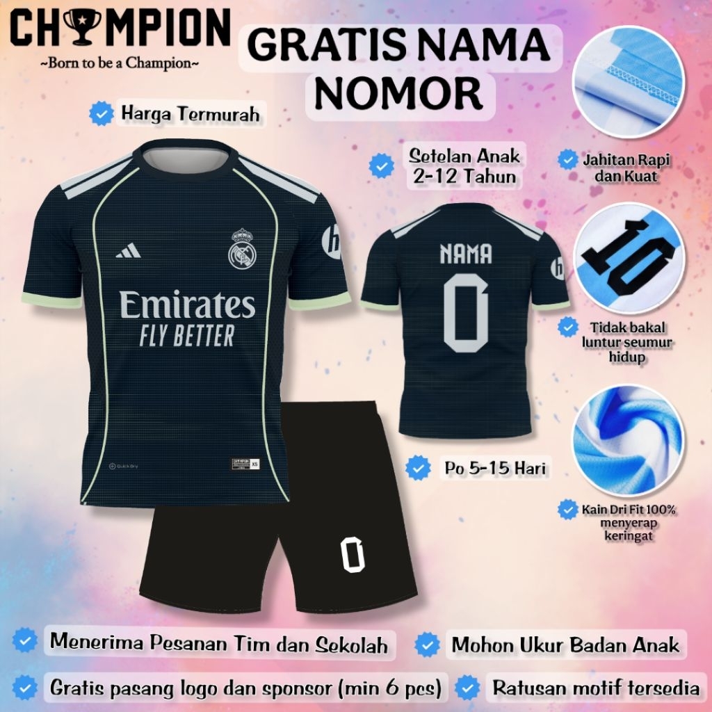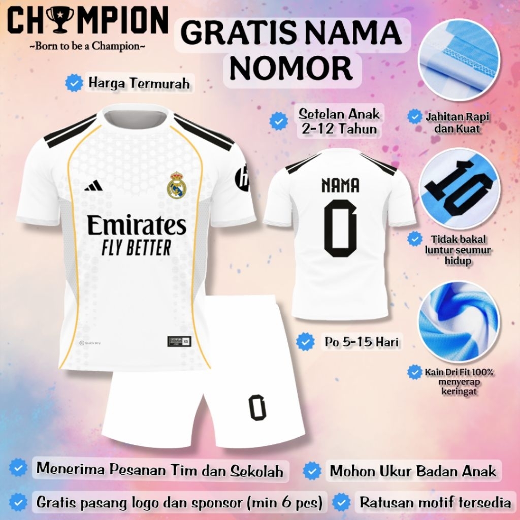 Setelan Baju Real Madrid 2026 Anak / Setelan Bola Anak / Setelan Futsal Anak (Gratis Nama Nomor)