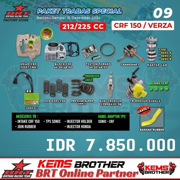 Paket CRF Trabas Spesial 9 Bore up 212-225CC Original BRT Head, Blok, Krukas, Nokenas, Ecu, Perklep, Perkopling, Tb Vel