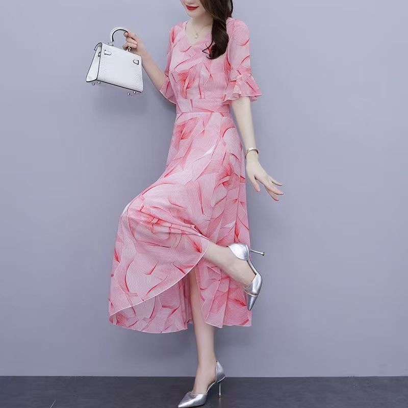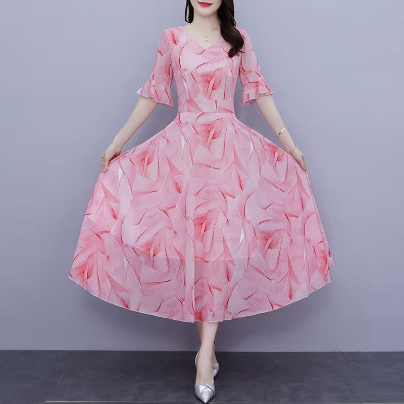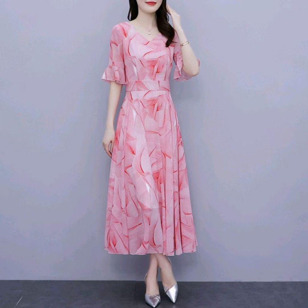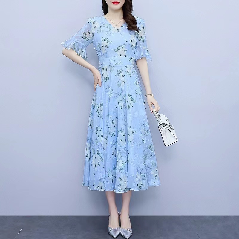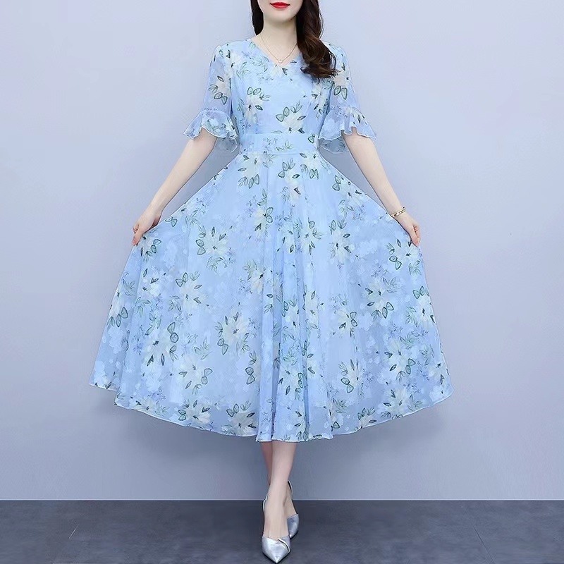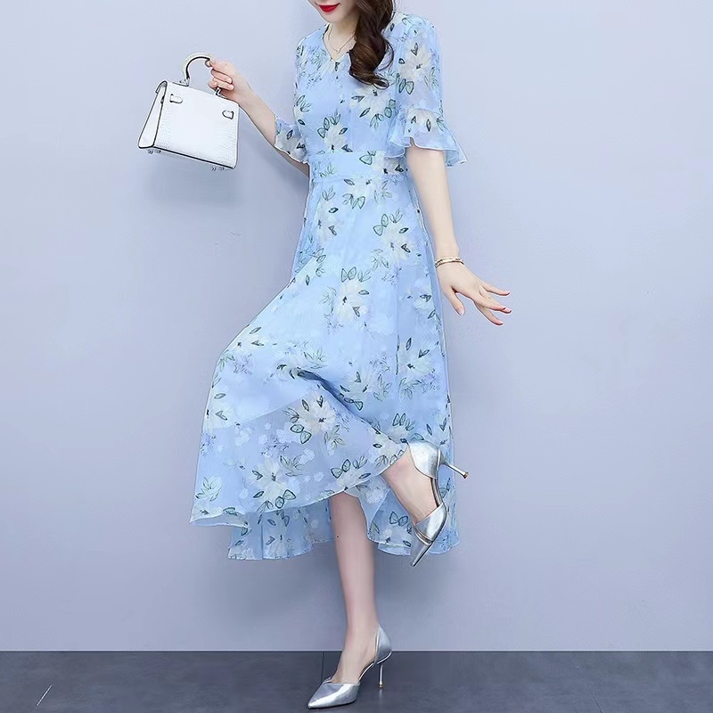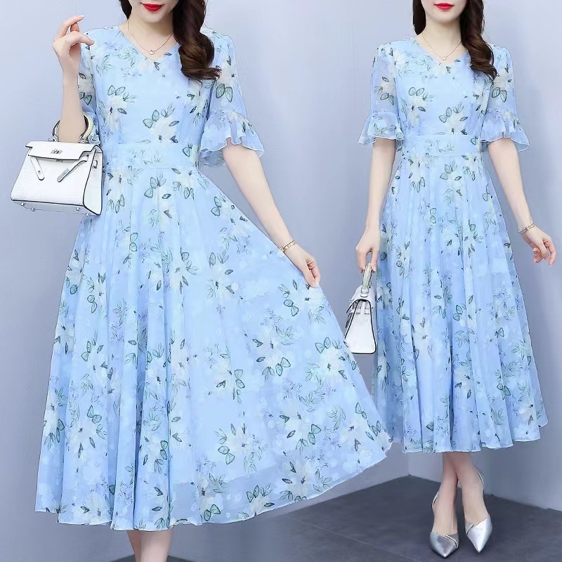 FAN Dress Motif Bunga Korean Style/Gaun Biru Cetak Kasual Korea/Gaun Pesta Mewah Elegan Terbaru