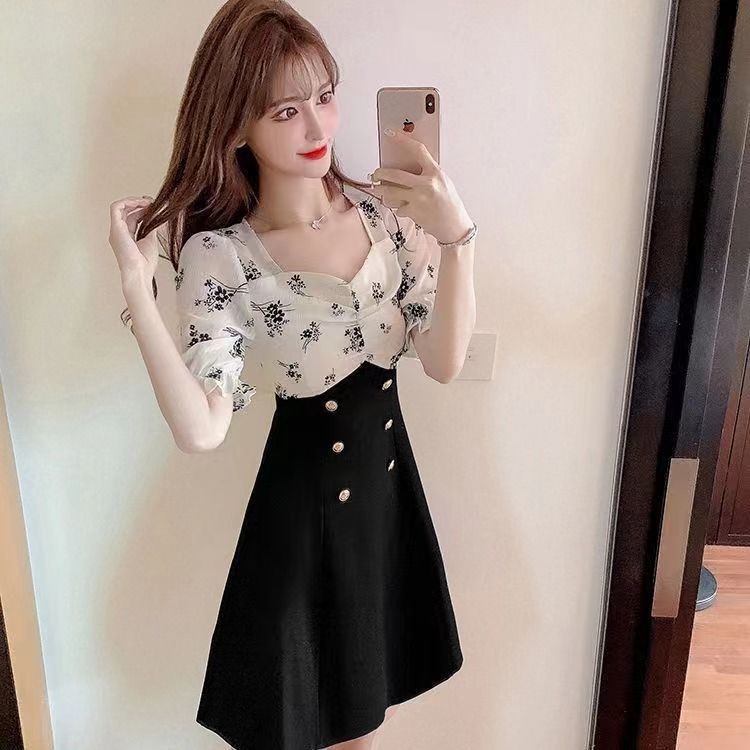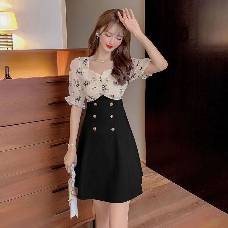 FANMU Gaun Sifon Mosaik Lengan Pendek Retro Perancis Baru 2025/dress korea