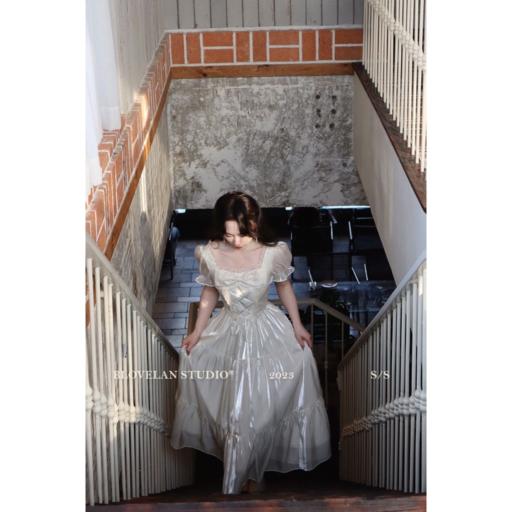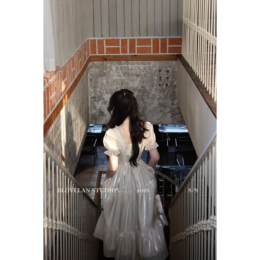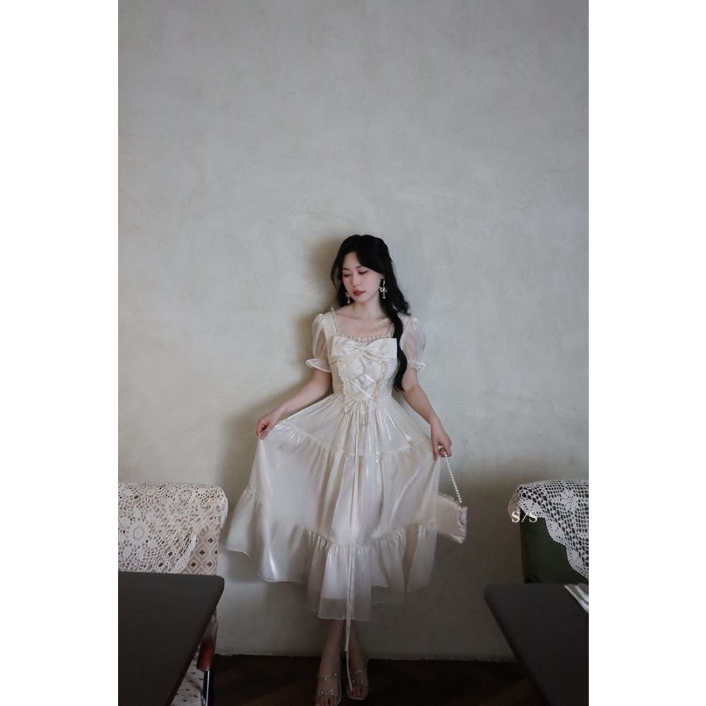 Gaun Panjang Leher Persegi Perancis Cahaya Bintang Mengambang Gaun Lengan Pendek Ramping Mengkilap Peri