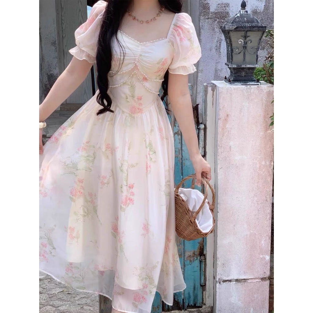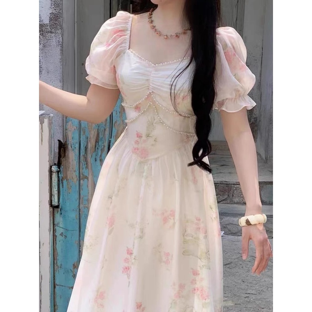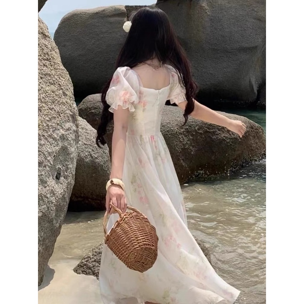 Gaun Bunga Manis Prancis Musim Panas Untuk Wanita, Lengan Engah, Temperamen, Desain Pelangsing Pinggang, Rok Panjang Hutan Khusus
