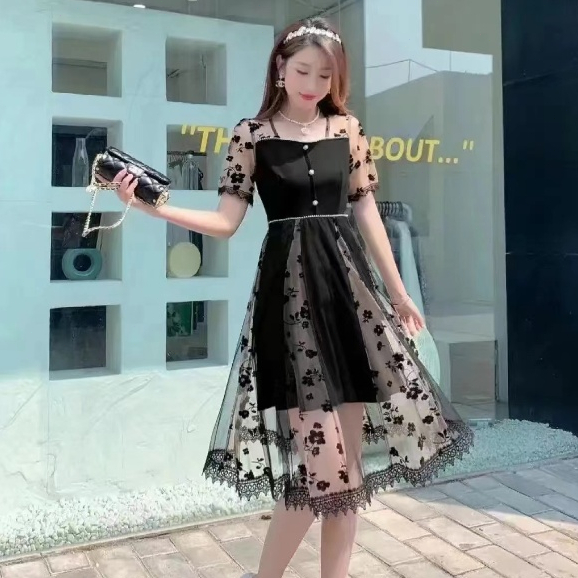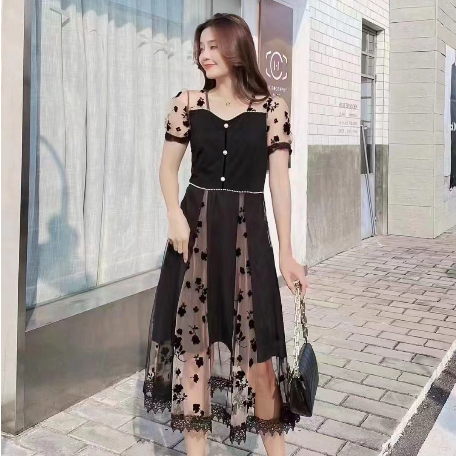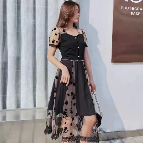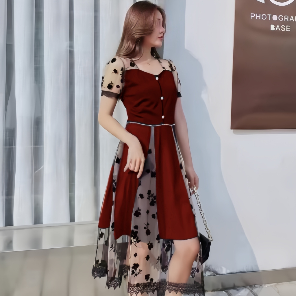 Gaun jahitan jala temperamen pengurang usia pinggang ukuran besar baru