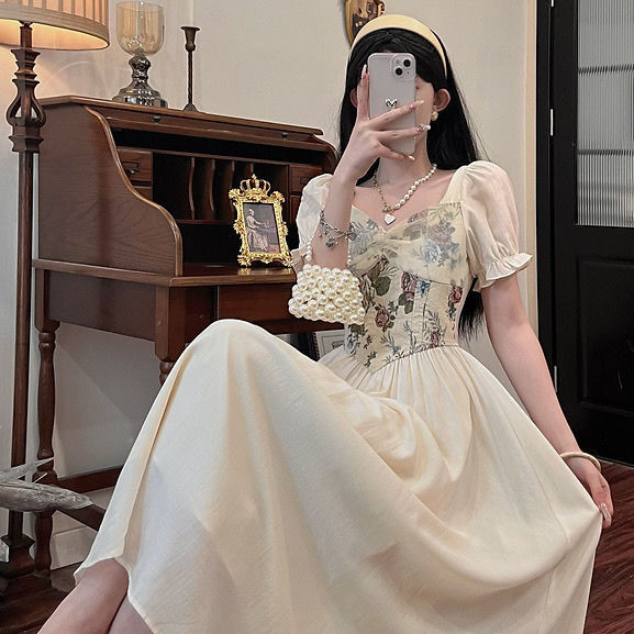 Gaun Gaya Hepburn Retro Perancis, Gaun Panjang Pelangsing Pinggang Teh Cinta Pertama Yang Manis