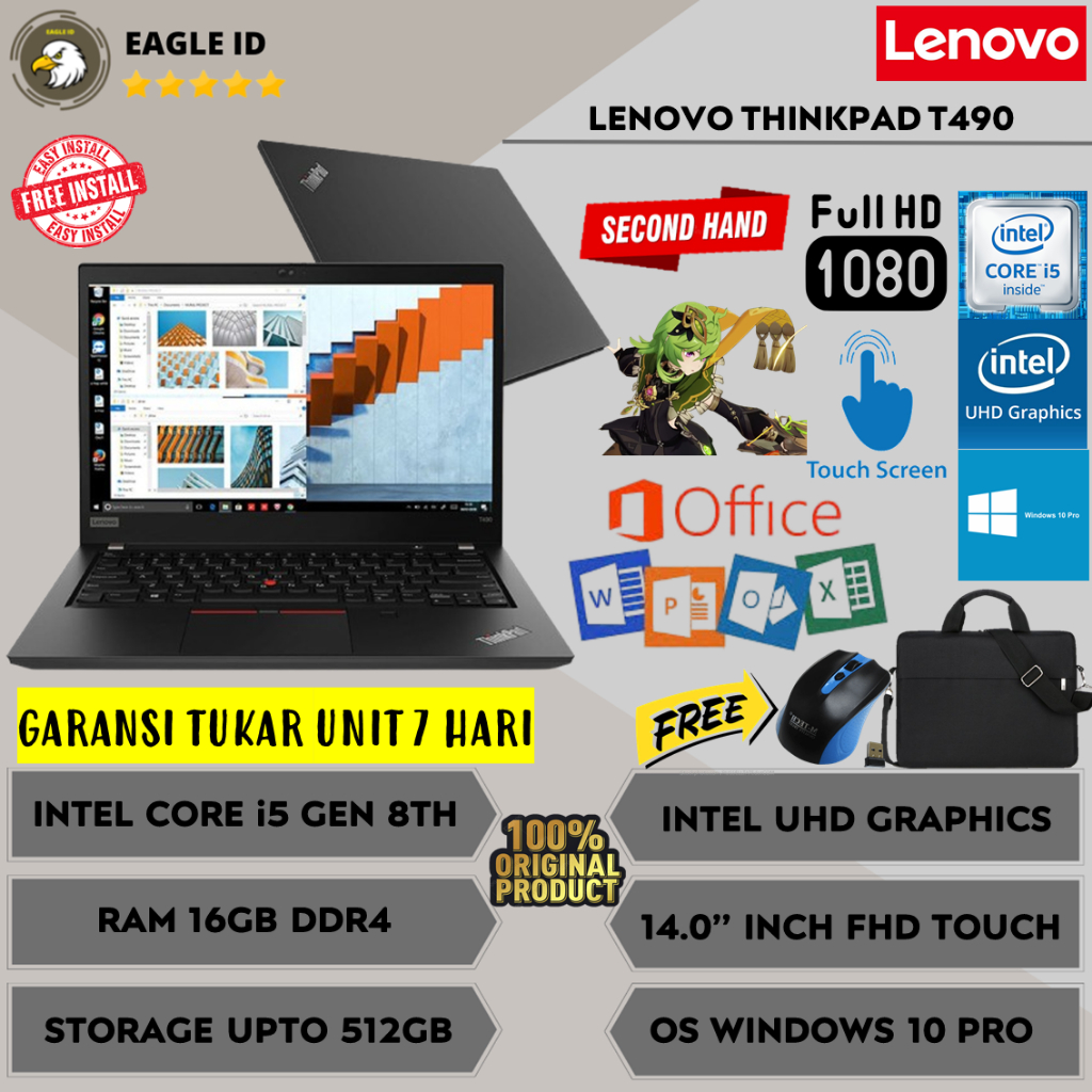 Laptop Kerja Lenovo ThinkPad T490 Intel i5 Gen 8th 14" FHD Ram 8GB DDR4 SSD 512GB Windows 10 Pro Ori