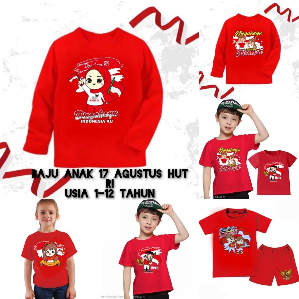 Kaos Anak Unisex Usia 1-12 Tahun Gambar Kemerdekaan Hut Ri 1945//Baju Anak Dirgahayu Kemerdekaan Ri 1945//Baju Anak Gamb