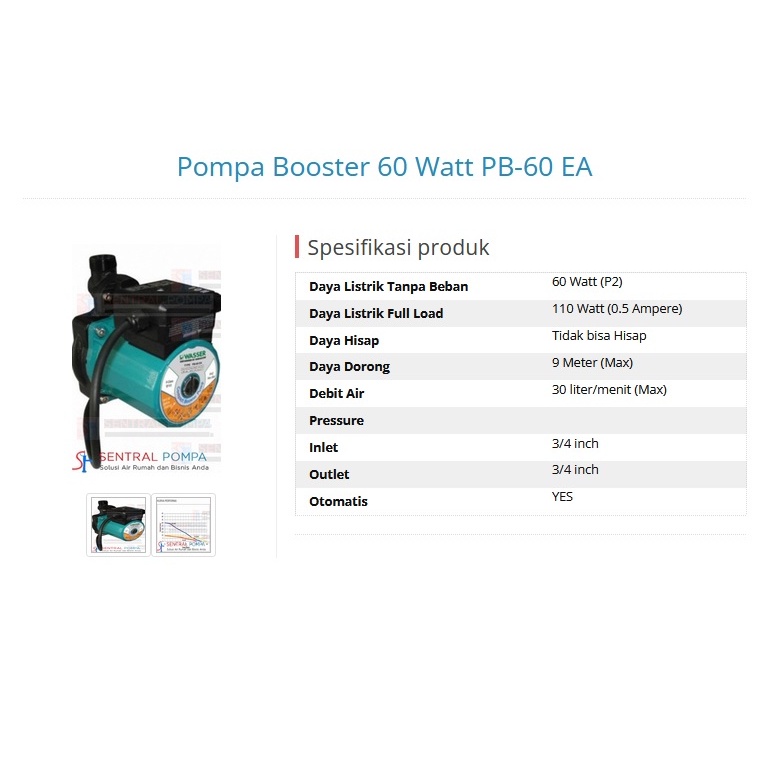 Pompa Booster Wasser PB 60 EA Pompa Air Dorong Watt Kecil Paling Murah 60 watt merk | Sentral Pompa