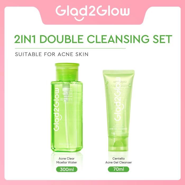 Glad2Glow 2in1 Double Cleansing set 2pcs Skincare Paket -Micellar Water+Cleanser-Blueberry anti-acne jerawat Ceramide C